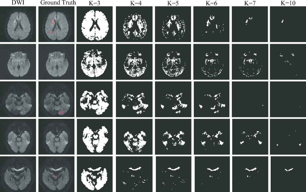 As the AIS lesions appear as hyperintense on the DWI, we adopt K-means clustering algorithm to identify the hyperintensive regions. Note that the artifacts on the DWIs are also the hyperintensive regions, making it crucial to fine-tune the value of