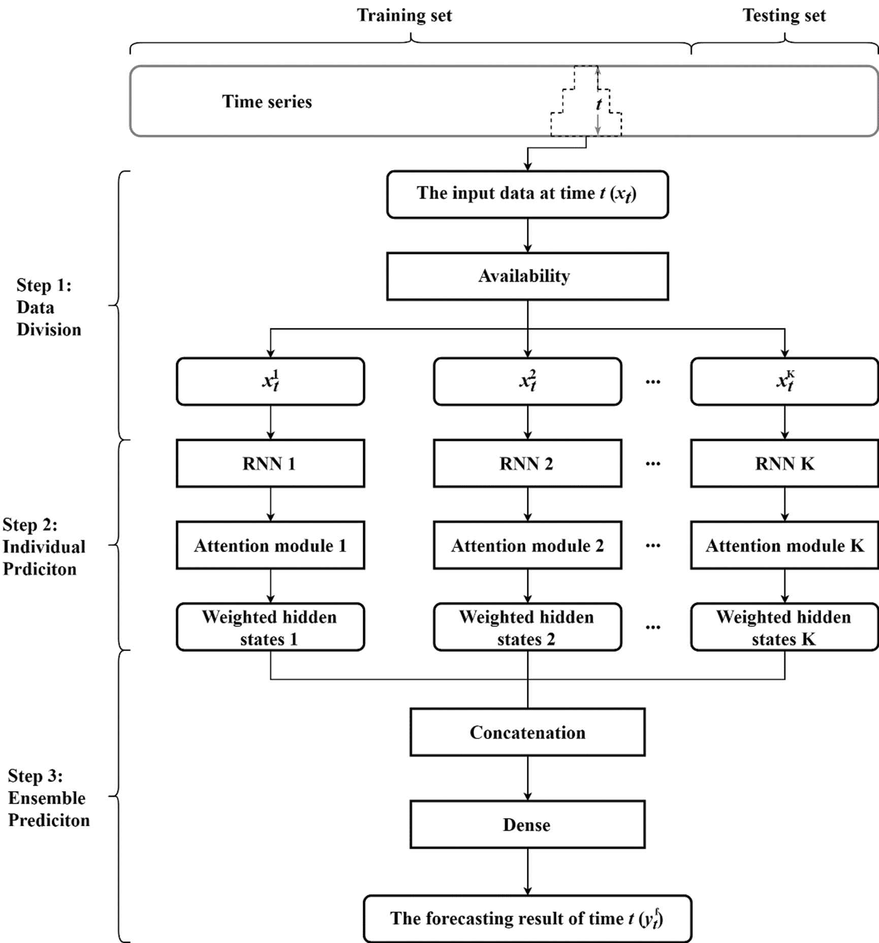 Attention-based RNN outputs the weighted hidden states in Step 2. In Step 3, all weighted hidden states are concatenated together as the input of the dense layer. This layer is a regular densely-connected NNs layer. And in this study, the activation of it is the sigmoid. Finally, the dense outputs the final ensemble prediction result of time t.