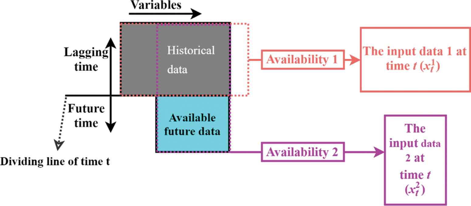 In the beginning, the input data matrix at time t may be in irregular shape because of the different data availability. Data can have different availability at time t because of the different frequencies in data collection or the unknown future information of some variables. According to the different availability, the input data can be divided into different inputting sub-matrices. Variables contained same availability are divided into one group as one input. Variables can be repeatedly used. High available variables can be included in low available variable-groups. Figure 2 gives the example of data division when the data have two availability.