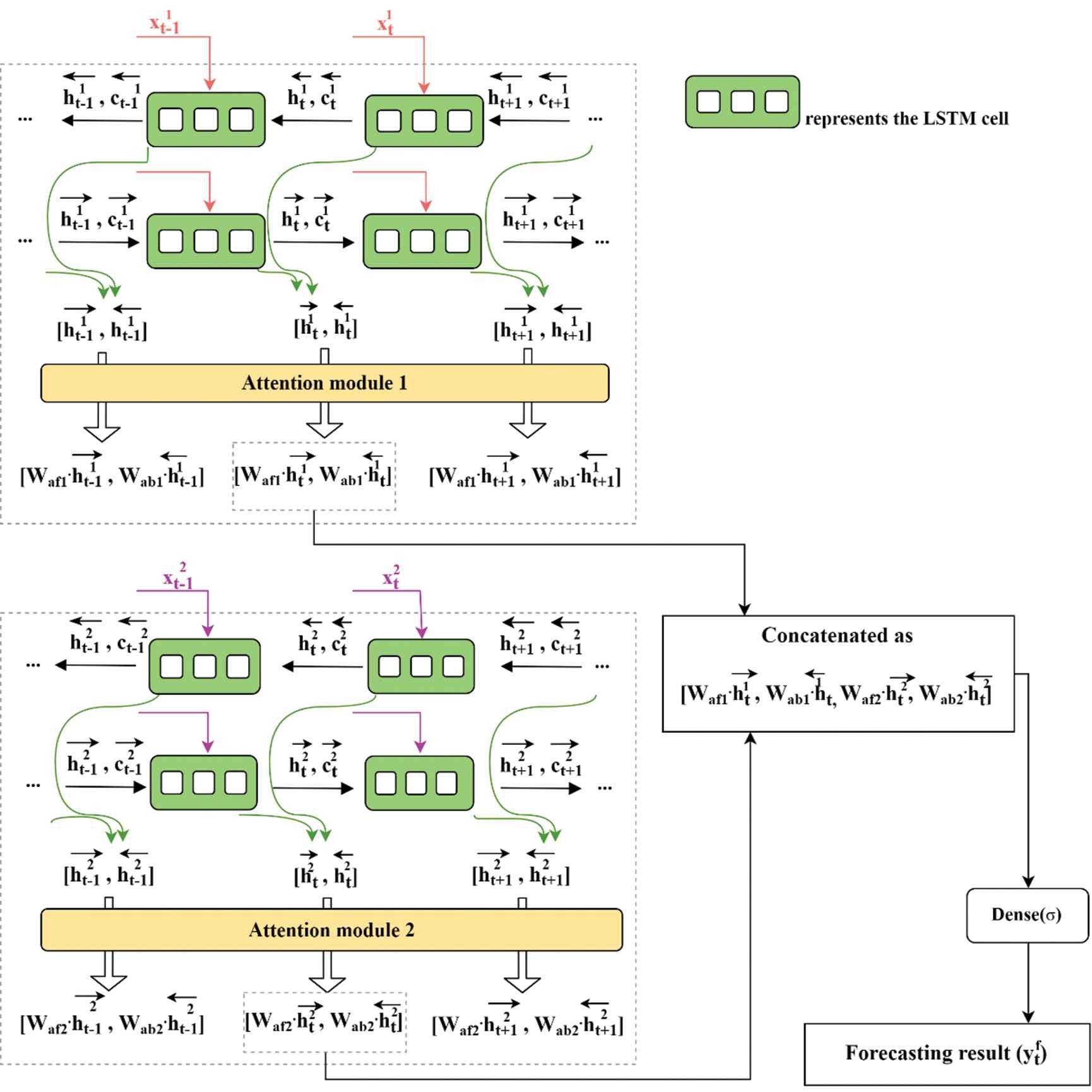 There are two available data on the predicted time t, available historical demand data and holiday data, and available future holiday data. Therefore, the input data at time t can be divided into two sub-matrices. Then, these two sub-matrices are respectively introduced into the BILSTM and attention module to obtain individual predictions. Individual prediction results