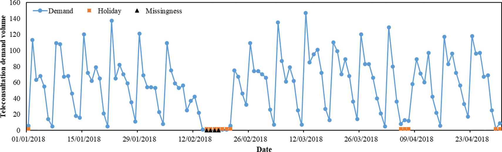 Besides the missing data, the holiday effect is significant in teleconsultation demand. Taking the data from January 1, 2018, to April 30, 2018, as example, the demand changes with date are shown in Figure 4. The holidays have two main effect on the demand. On the one hand, the demands in the holidays are much less than the ordinary working days. And the demands before and after holidays are also less than ordinary working days. On the other hand, the holidays bring variations on the weekly pattern of teleconsultation demand. In Figure 4, it can be also observed that some missing data are caused by the holidays. Before missing data treatment, the variables relating to the holiday are selected.