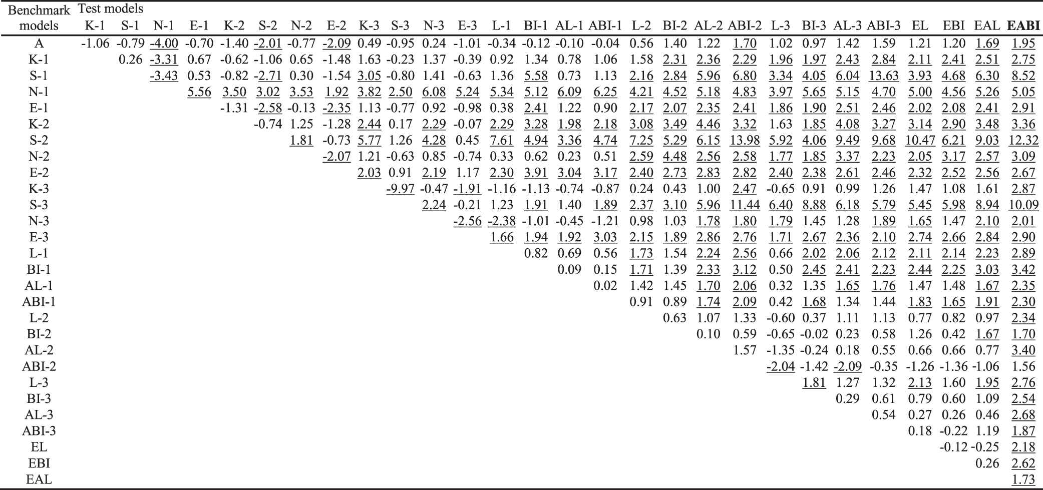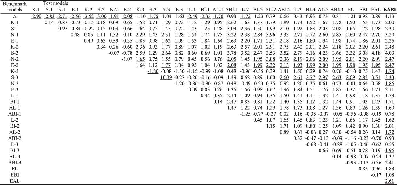 Notes: (1) Model abbreviations: A: ARIMA, K-1: KNN-1, S-1: SVR-1, N-1: NN-1, E-1: ELM-1, K-2: KNN-2, S-2: SVR-2, N-2: NN-2, E-2: ELM-2, K-3: KNN-3, S-3: SVR-3, N-3: NN-3, E-3: ELM-3, L-1: LSTM-1, BI-1: BILSTM-1, AL-1: A-LSTM-1, ABI-1: A-BILSTM-1, L-2: LSTM-2, BI-2: BILSTM-2, AL-2: A-LSTM-2, ABI-2: A-BILSTM-2, L-3: LSTM-3, BI-3: BILSTM-3, AL-3: A-LSTM-3, ABI-3: A-BILSTM-3, EL: ELSTM, EBI: E-BILSTM, EA-L: EALSTM, EABI: EA-BILSTM. (2) The underlines are out of range (-1.65, 1.65), meaning the MAE difference are significant. (3) The bold model gets the lowest MAE.