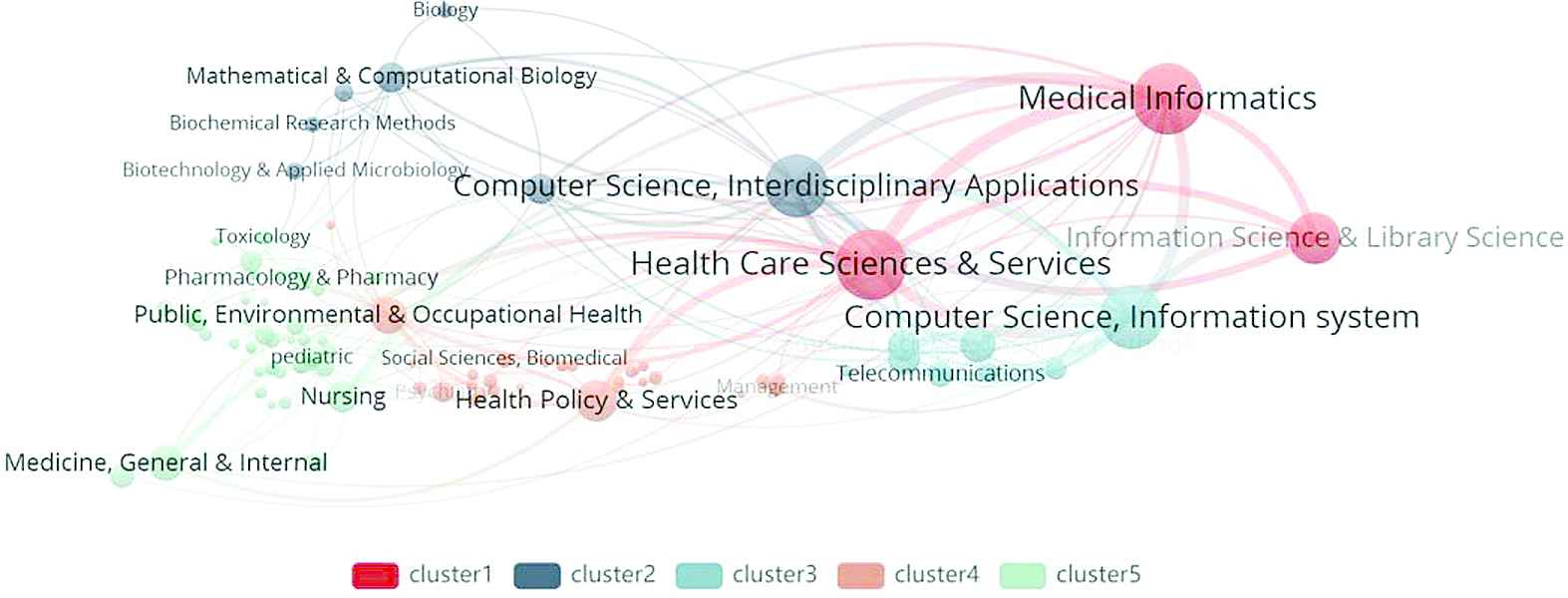 Cluster 1 includes “medical informatics,” “information science and library science,” and “health care science and services.” These three subjects are directly related to the birth of EHRs. “Medical informatics” and “information science & library science” regard computer science as technology support, thus they are closely related to computer science and its interdisciplinary applications.