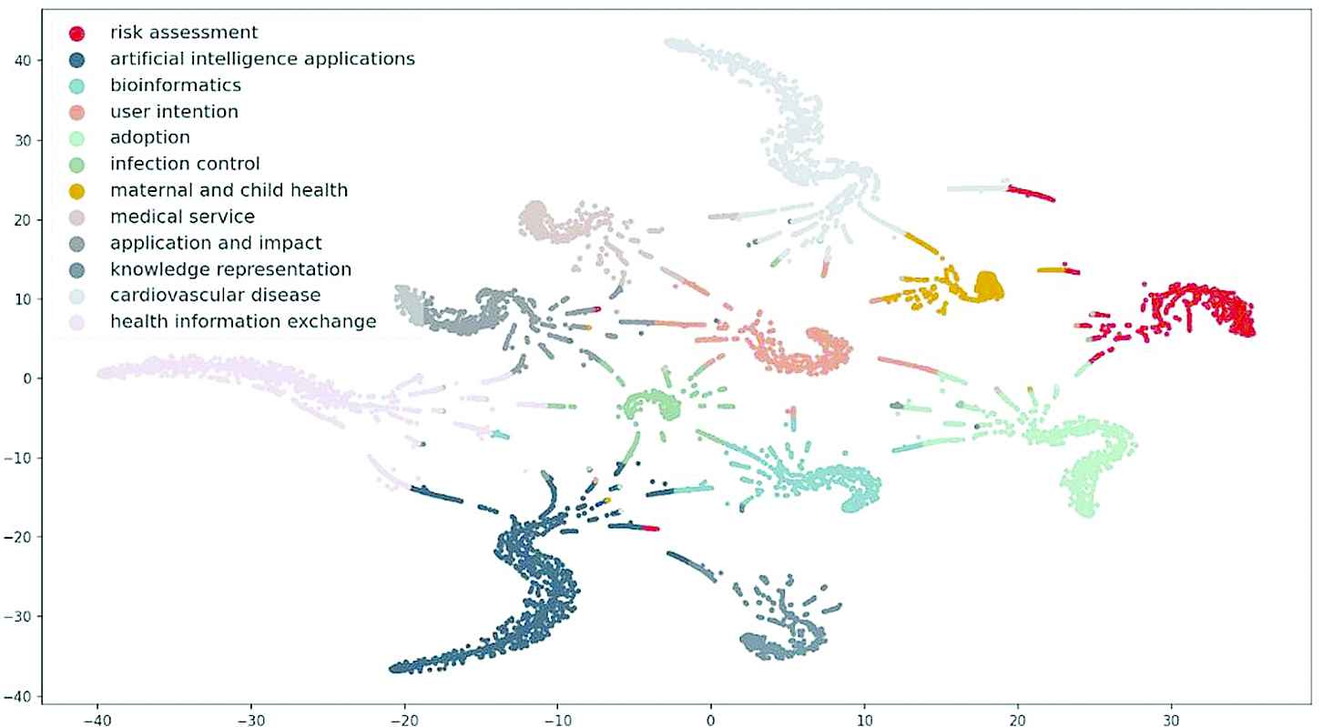 This paper used the lda2vec algorithm to cluster the title and abstract, set the number of topics to 12. The topics and keywords of EHRs are shown in Table 2. T-SNE algorithm was used for reducing the dimension of the result data and its visualization, as shown in Figure 7.
