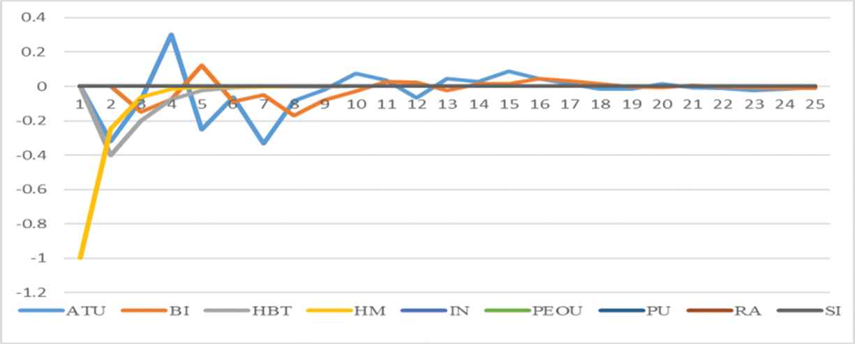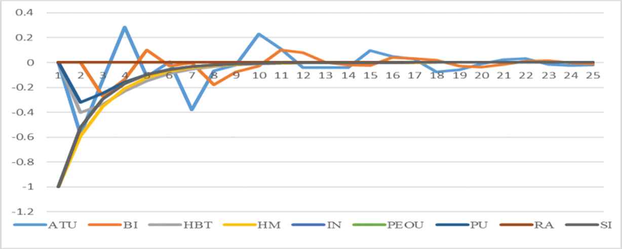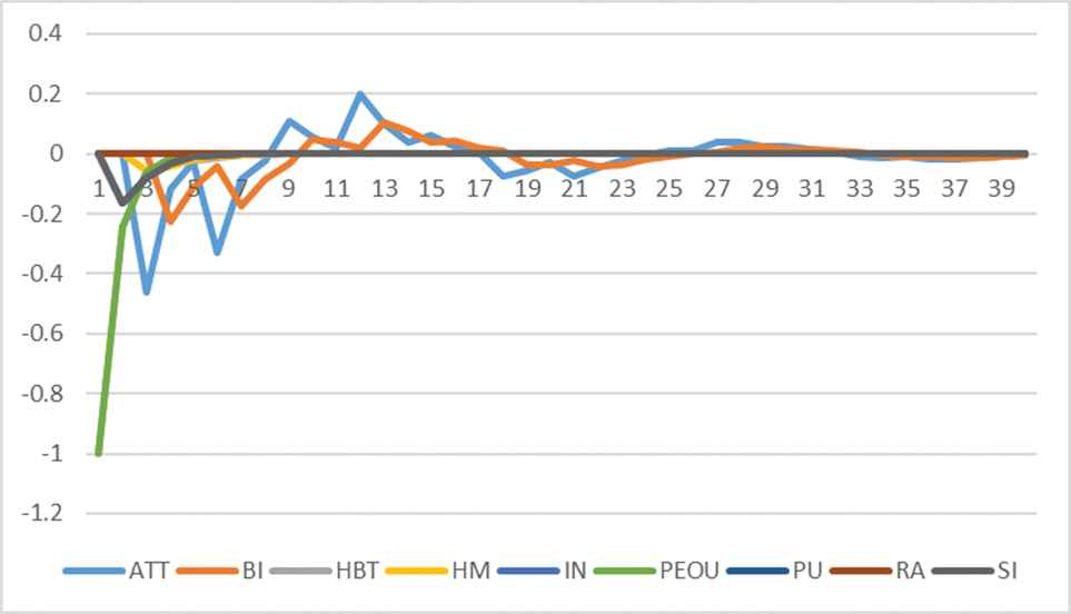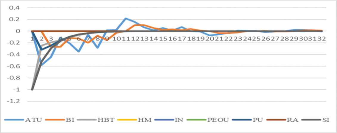 We run the third scenario as the absence of HM and SI for Gen Y. Figure 8 shows the absence of HM and SI in the system. When both factors take from the system, ATU and BI are affected negatively in the short term. Both of them have increased after decreasing in the first place, however, they have decreased after that, and they have increased after that. Gen Y's online shopping behavior has positively and negatively demonstrated a wavy shape under the lack of SI and BI.