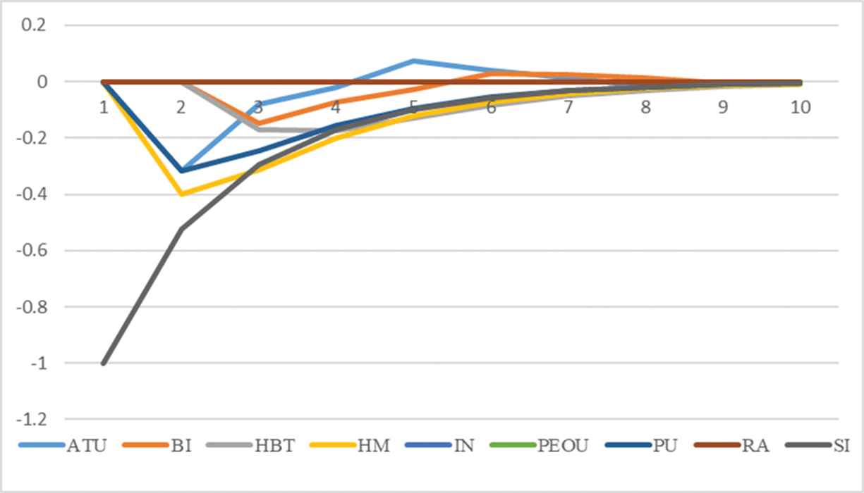 The second scenario for Gen Y is the absence of SI. Figure 7 represents the simulation of the lack of SI in the system. ATU and BI have increased in the first place despite the decrease. It can be deduced that SI has almost no impact on customer online shopping behavior for Gen Y.