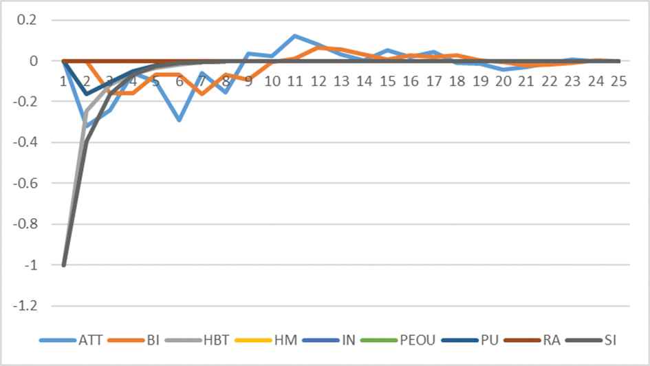 Figure 12 shows the absence of the HM and SI condition for under crisps coefficients for Gen Y. As it can be seen in Figure 12, ATU and BI have reached a positive scale after the 9th iteration. Under the hesitant fuzzy condition, we positively observe the same iteration number; however, we cannot see positive behavior between the start and ninth iteration under the crisps coefficients. Differently from the under crisps condition, we can see more various detail about factor's behavior journey