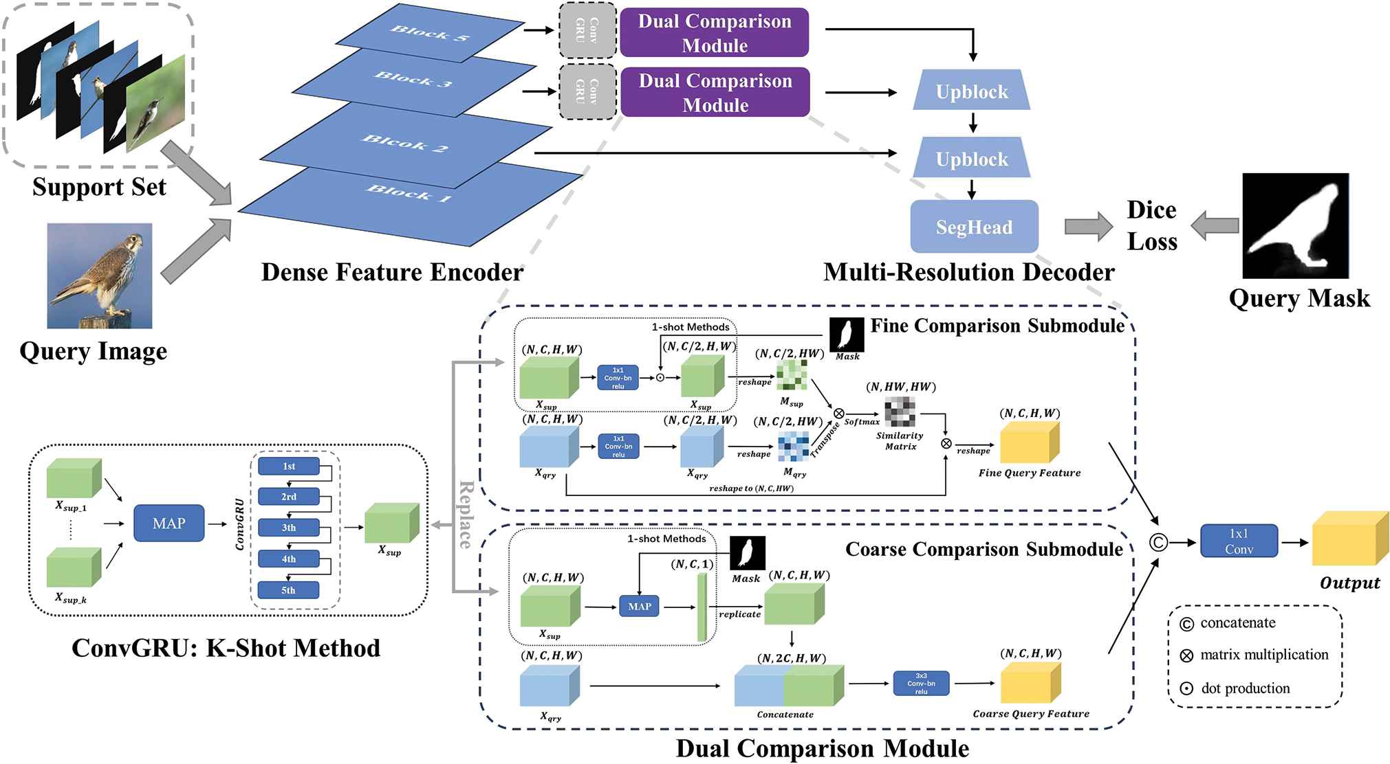Dual Comparison Module is the core part of our proposed model. It can be divided into two independent submodules: the fine comparison submodule and the coarse comparison submodule. The similarity calculated in both comparison submodules can be viewed as the supervision information, which guide the decoder to generate the segmentation mask.
