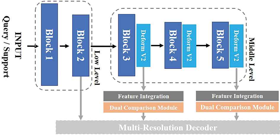 Dense Feature Encoder indicates to extract feature representations at different levels from the query and support images simultaneously. Convolutional neural network is the most widely used feature extractor. As is observed in the visualization of the convolutional neural networks and previous few-shot segmentation research [10], features in the first several layers contain more information about the edges and colors than the last few layers which have stronger class information, while middle layers have more attribute information which is shared by different categories. Since the training set and test set have no duplicate categories, we cannot assume that the feature encoder can extract the features of unseen categories during training. Middle-level attribute features are more important to the few-shot task. Therefore, we choose the middle-level features from block 3 and 5 of the dense feature encoder for the dual comparison modules. Both the support and query branch use the same feature encoder.