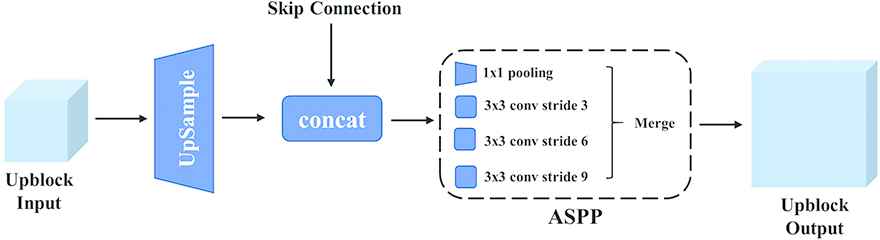 Upblock in the multi-resolution decoder. Upblock makes fusion of features with different resolution. We also introduce the ASPP module to adapt to different scales of the targets.
