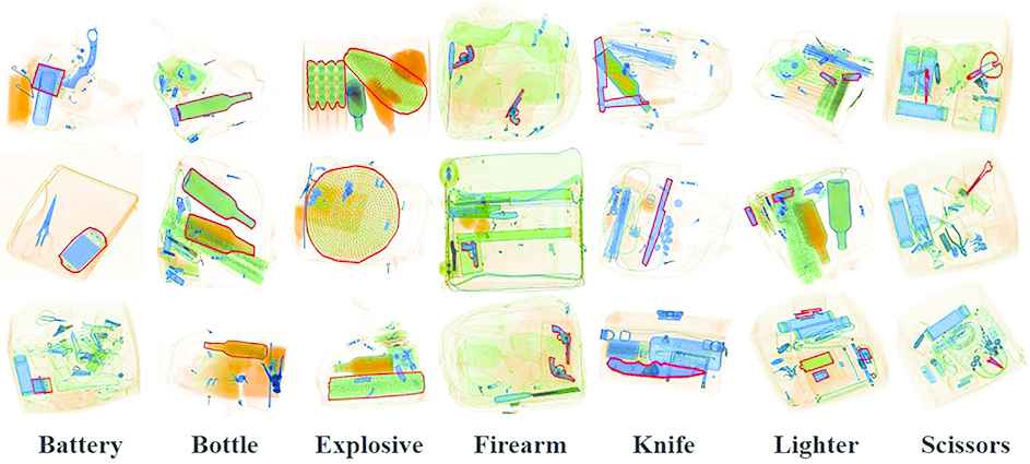 The X-ray-PI dataset contains 7 categories of prohibited items (Battery, Bottle, Explosive, Firearm, Knife, Lighter, Scissors) within total 2407 annotated images. Figure 8 shows some examples in the X-ray image dataset.