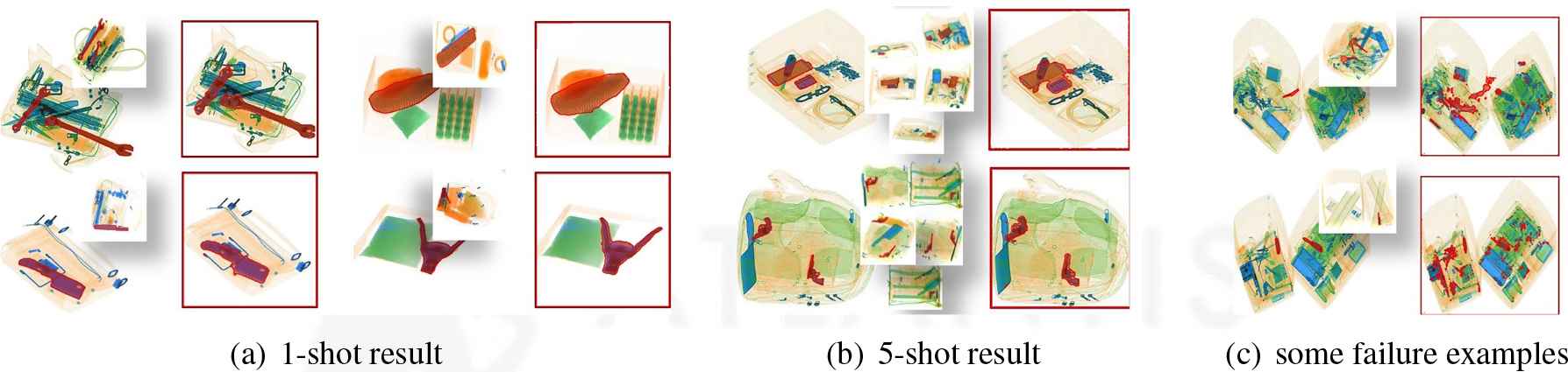 The result of our DCNet on X-ray-PI dataset. (a) The 1-shot result. (b) The 5-shot result. (c) Some failure examples of 1-shot task. In each group of the results, the small image patches are the support samples, and images with red edge are the segmentation result.