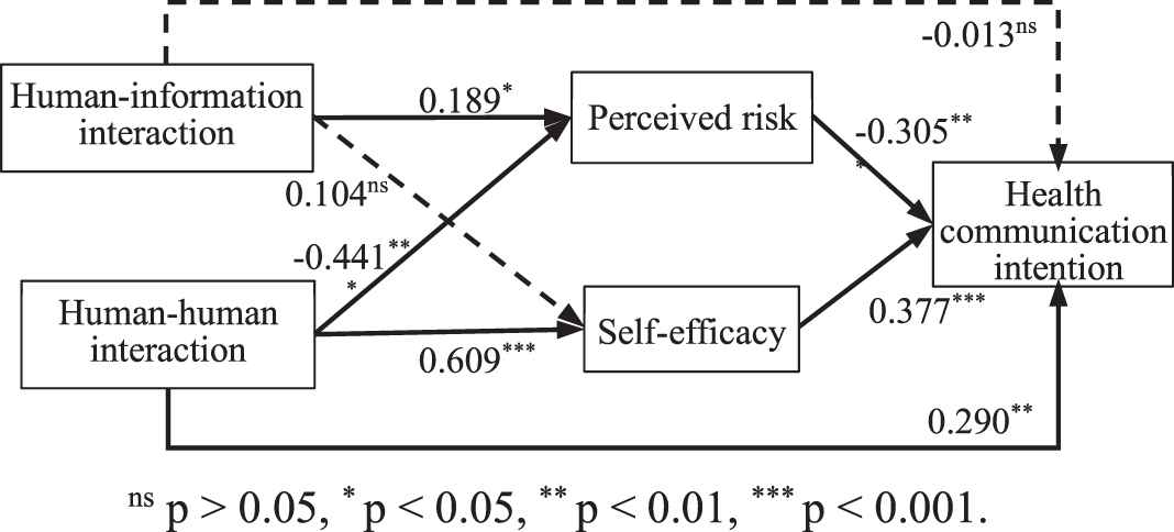 We further tested the mediating effects of self-efficacy and perceived risk on human–information interaction, human–human interaction and HCI using the bootstrap method in AMOS. The results are demonstrated in Table 5. The results show that human–information interaction affects health communication intentions through the complete mediating of perceived risk