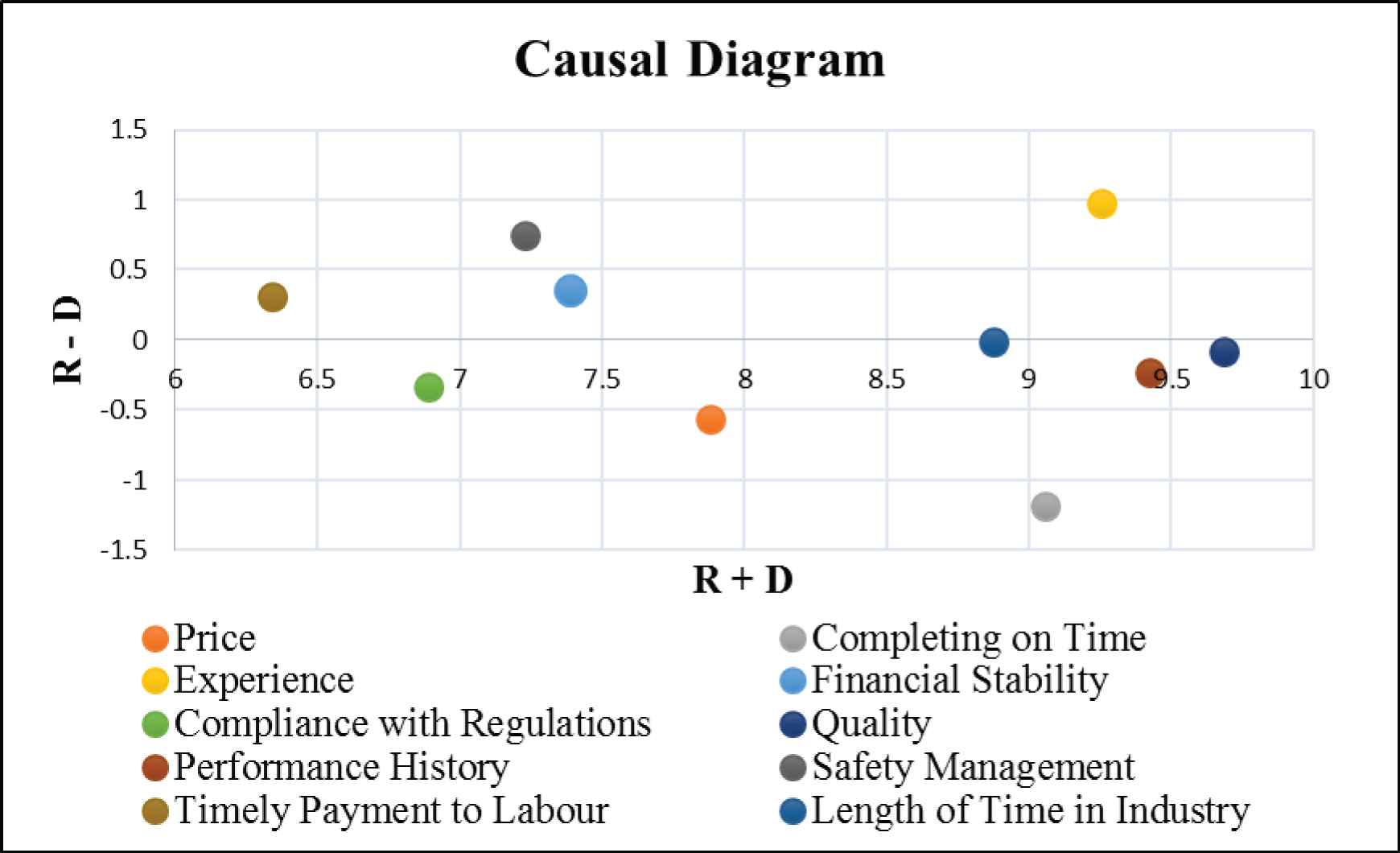 Based on the information from the causal diagram (see Figure 1), the criteria are divided into two groups by x-axis. The cause criteria are Experience, Safety Management, Financial Stability, and Timely Payment to Labor as the (RD) is positive. On the other hand, the effect criteria are Length of Time in Industry, Quality, Performance History, Compliance with Regulations, Price, and Completing on Time. This result also indicates that “Experience” is the most important criteria in subcontractors selection owing to the largest value of (RD).