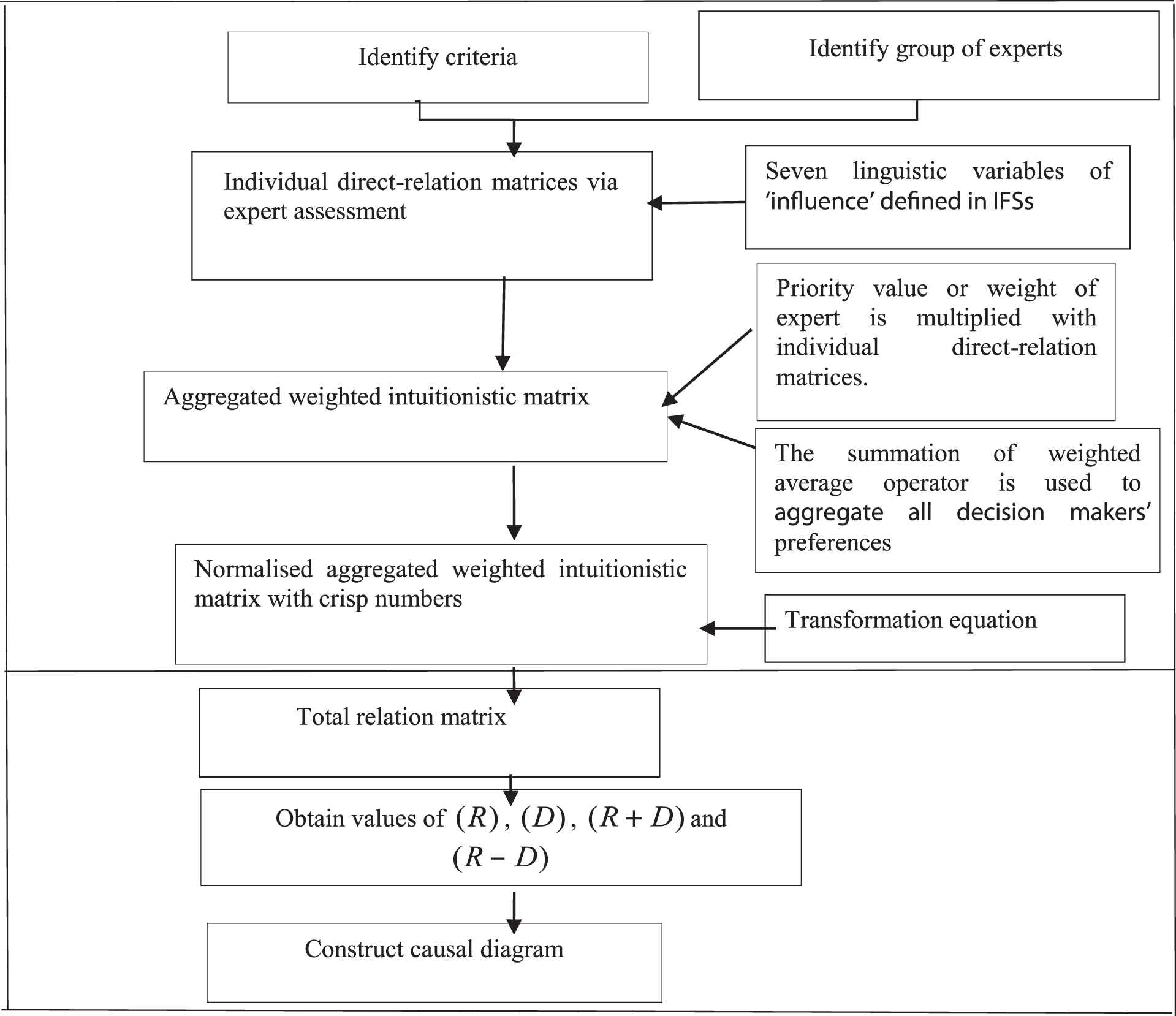 The DEMATEL is a classical method for solving criteria of MCDM problems. It can be used to visualize the relationship between criteria. The DEMATEL also can be used to separate all criteria into two groups which are known as cause and effect groups. As an extension of DEMATEL, the fuzzy DEMATEL was proposed by many researchers and applied to various fields [4,5,8,28,36]. With further extension of fuzzy DEMATEL, this section presents the IF-DEMATEL method in which the fuzzy DEMATEL is modified by introducing the IFS into the fuzzy DEMATEL. As a result of this fusion, the proposed IF-DEMATEL has several innovations. Firstly, instead of considering equal weights among the experts, this proposed method introduced relative weights of experts based on the three numbers of IFSs of five linguistic terms. Proportion equation proposed by [28] is adopted to the proposed method. Secondly, individual assessment of experts is aggregated using the concept of summation of weighted average. This is an averaging operator where relative weight of experts is multiplied with decision assessment. Finally, in this proposed method, we introduce a transformation equation instead of typical defuzzification method to transform two numbers of IFSs to single crisp numbers. These three innovations are embedded into the general framework of DEMATEL where total relation matrix is used to derive causal and effect groups of criteria. In this section, we present an improvement to the DEMATEL where the IFS is the prominent element in the proposed method. It is illustrated in Figure A1 (See Appendix).