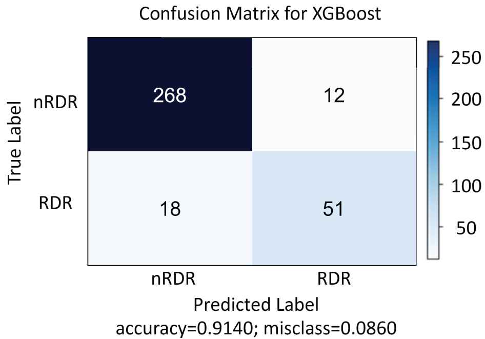 To analyze each case (NRDR, RDR), we presented the confusion matrix of the best classifier, the XGBoost algorithm. For NRDR cases, the XGBoost algorithm classified 268 out of 280 observations correctly, while 51 out of 69 RDR observations were correctly classified. In the confusion matrix given in Figure 3, it can be seen that the misclassification error for RDR cases was greater compared to NRDR cases. This could be due to the number of RDR images being significantly lower than the NRDR cases, which affects the proposed model's detection performance.