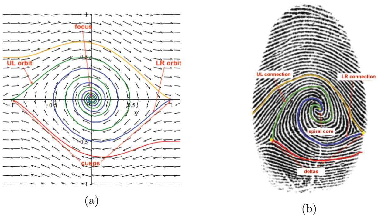 A Few studies talked about mathematical modeling of the whorl fingerprint specially using the phase portraits of a system of differential equations. The idea of phase portraits in texture modelling can be seen in [22] where a characterizing oriented patterns was proposed using the qualitative differential equation theory to analyze real texture images, but no fingerprint image seems to have been considered. In the thesis by Ford [23], the complex flows were divided into simpler components which are modeled by linear phase portraits and then combined to obtain a model for the entire flow field, this idea was applied to fingerprints in [24].