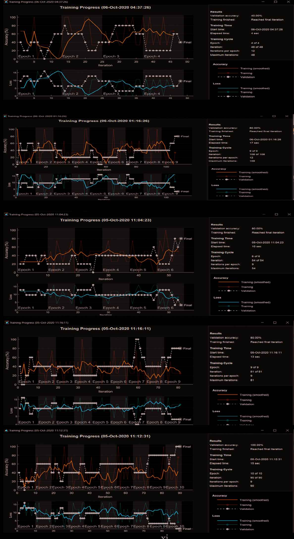 Figure 7 shows different MaxEpochs experiments after retraining VGG16 using MATLAB. The image data store is divided into 0.7 for training class and 0.3 for validation class using the following fragment MAT LAB code: [imdsTrain, imdsValidation] = splitEachLabel(imds, 0.7, “randomized”) and the image size is [224 224 3].