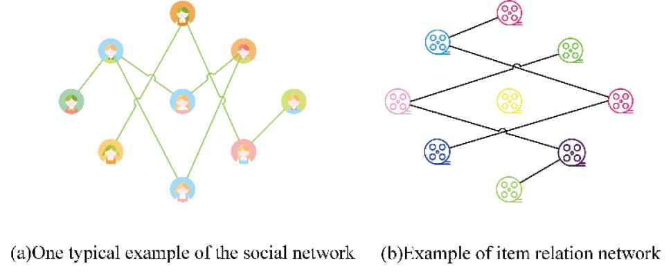 The recommendation scenario in social networks is shown in Figure 2, which consists of two central elements: the network diagram of the social relationship between users and the network diagram of the relationship between items.