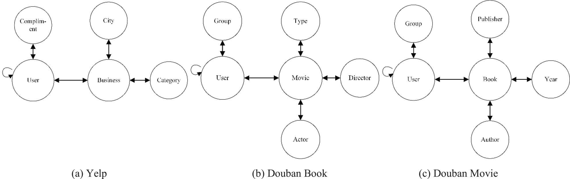 The HIN contains many types of nodes and links. The meaning of the connection of two nodes of the same type can be changed due to the different connection paths. The metapath is composed of a sequence of relationships of different objects, which defines the complex relationship from the first node to the last node in the sequence path. For example, the path User-Movie-User (UMU) represents the user watching the same movie as the target user, while the path User-Movie-Type-Movie-User (UMTMU) represents the user watching the same type of movie as the target user. In Table 1, we give the definition and semantic description of metapaths under the three data types used in this paper.