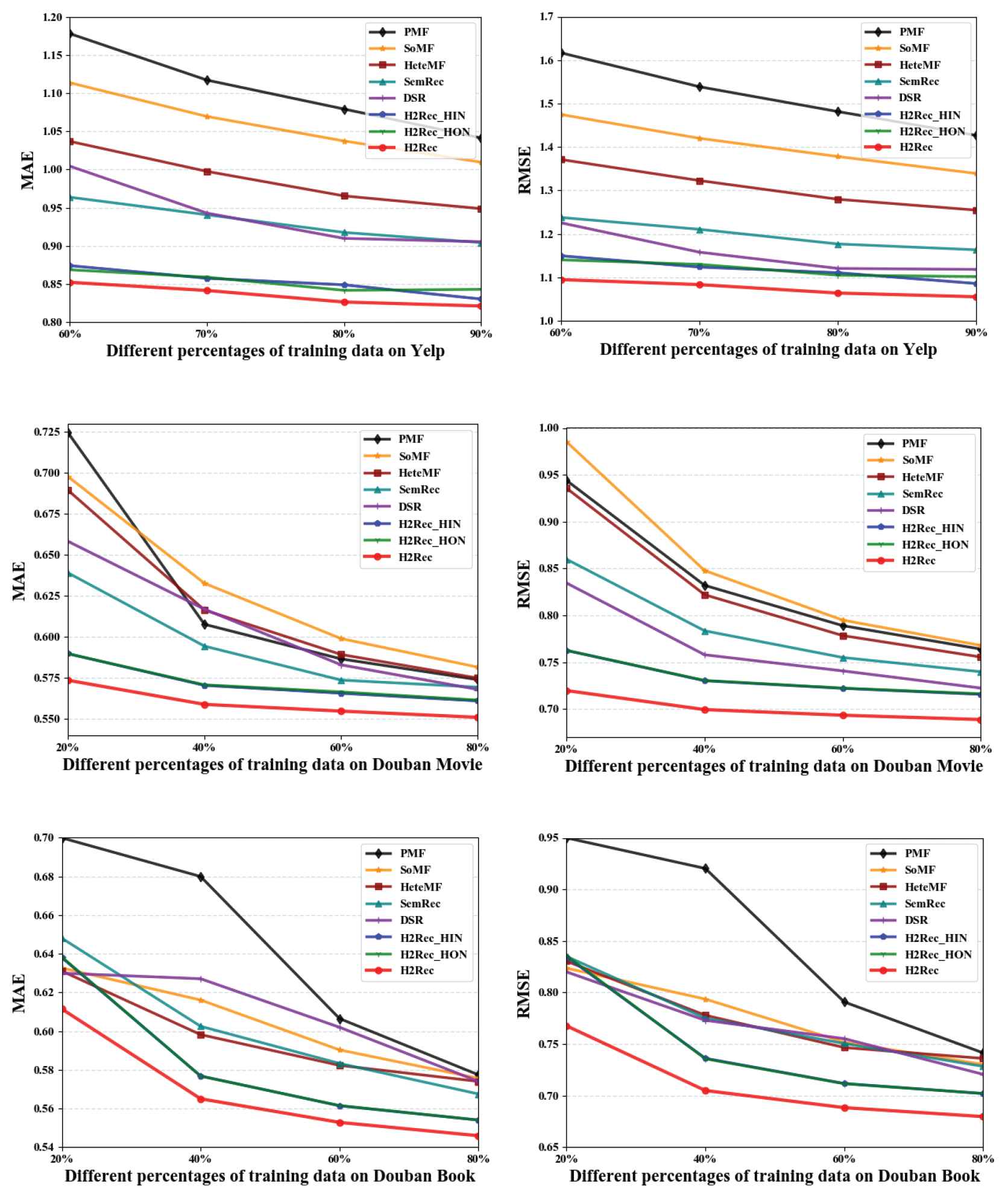 First, we divide the three datasets into a training set and a test set and set the five training ratios of the datasets Douban Movie and Douban Book to {20%, 40%, 60%, 80%}. Since the Yelp dataset is very sparse, its five training ratios are set to {60%, 70%, 80%, 90%}. For each ratio, we randomly generate ten evaluation sets. We average the results as the final performance. The experimental results are shown in Table 3. For conducting a more intuitive analysis, the line chart (see Figure 6) was drawn based on the data from Table 3.