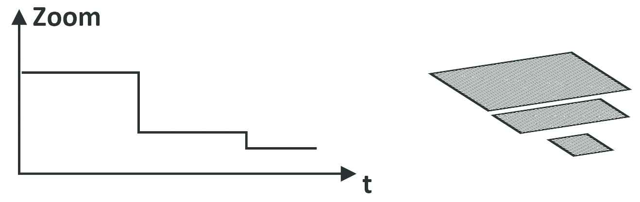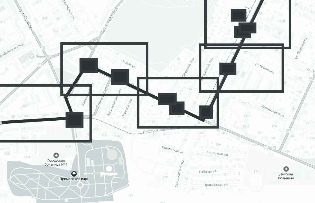 In terms of recommendations to the user for manipulating the image during analysis, in the context of C0, the trend pattern is supported. The knowledge of the trend is that users-analysts study the map, periodically zooming in near delivery points and zooming out on travel paths. This is shown schematically in Figure 5. Shaded and not shaded rectangles represent image fragments of two different scales. The solid line is the path of the vehicle.