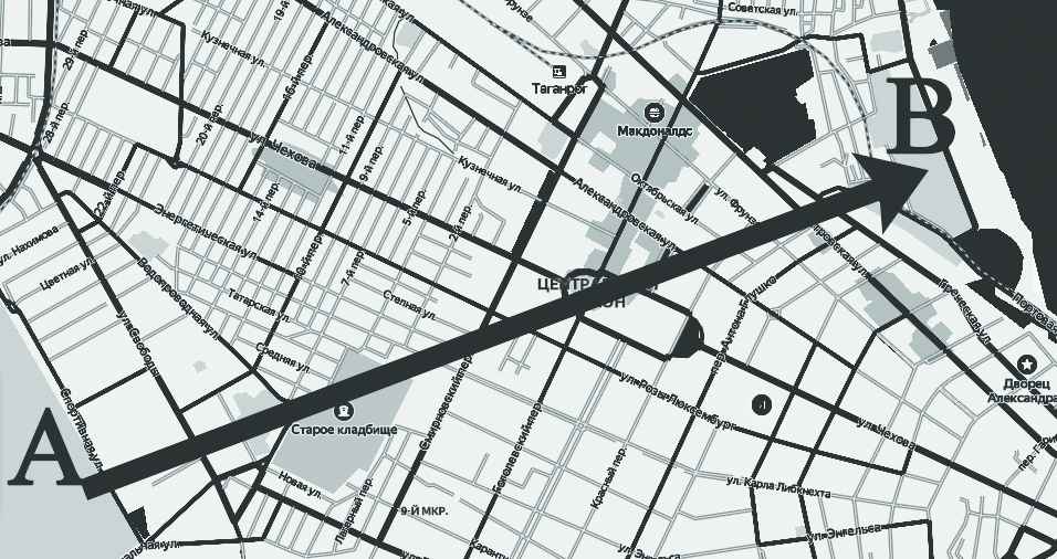 Consider the following problem: you need to transport cargo from point A to point B that has an unusual combination of weight, dimensions, and transport conditions. The spatial situation is shown in Figure 4. There is no simple solution to this problem, so you have to analyze the situation and make some kind of out-of-the-box decision. Suppose there is an expert who has experience with a similar problem. How to present this knowledge of solving such problems using GIS? The first step is to build the chain of contexts used by the expert in a particular situation. Let the following contexts be described in the GIS: