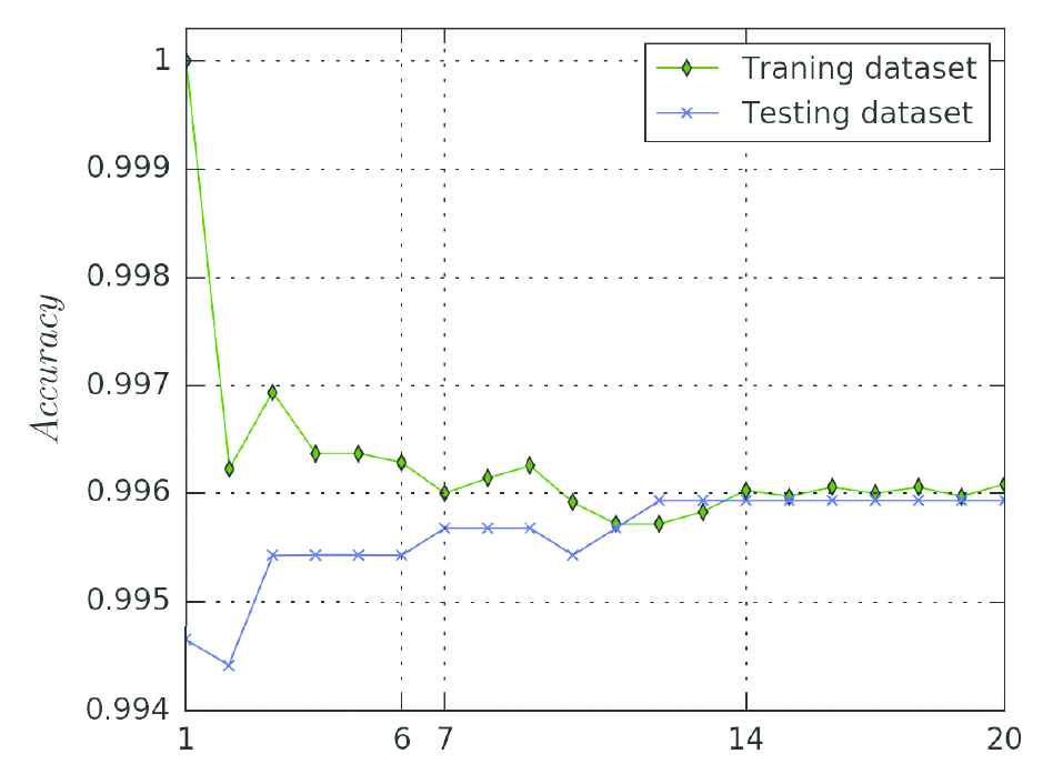 The accuracy of the KNN with different parameter K displayed in Figure 7, in which the green curve come from the training data set and the blue one come from the testing data set. The training accuracy decreased with the increase of the K, while the testing accuracy increased conversely.