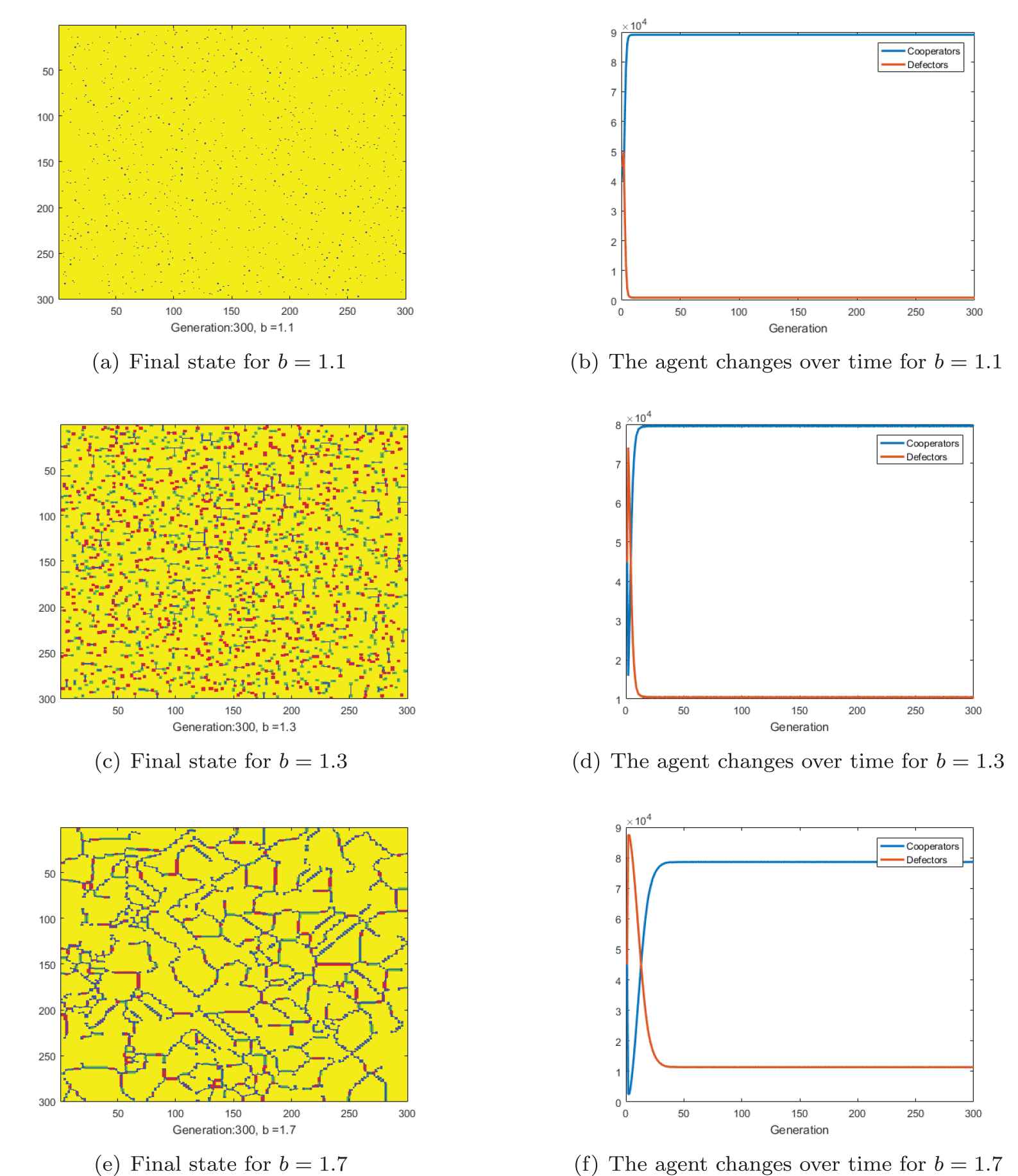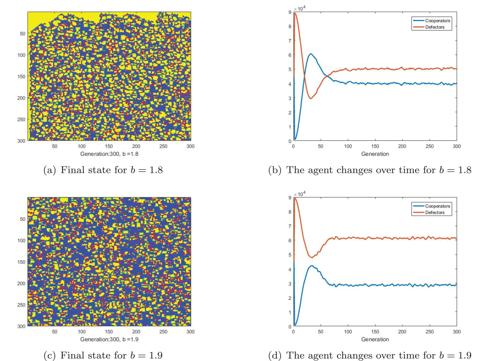 From Figure 4(a–f) we can see the number of cooperators suddenly dropped owing to agents being isolated and surrounded by defectors, hence a few cooperators that survive will create small clusters and then rise in numbers, so the cooperators quickly become dominant over the defectors after a few generations when the temptation factor b is lower.