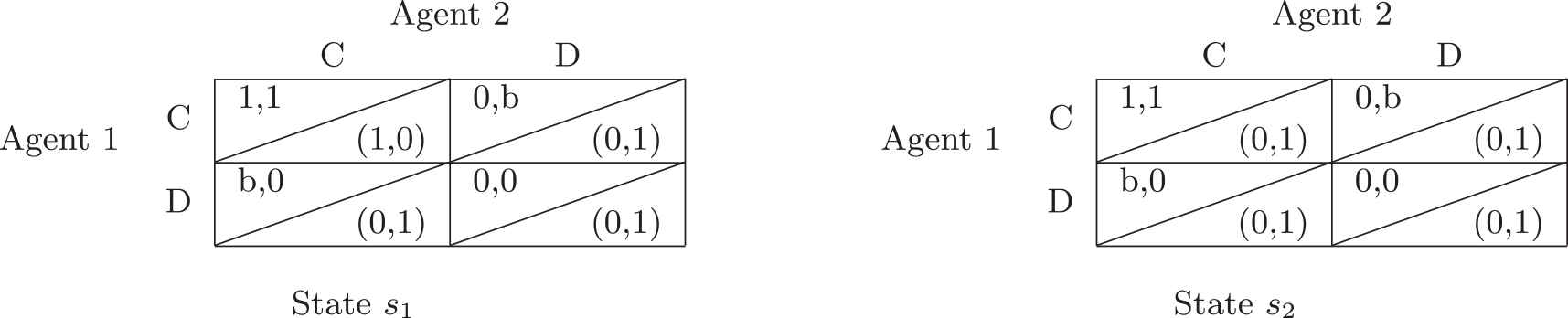 Let N={1,2} be the set of two agents, agents' state sets are S={s1,s2}, b(b>1) denotes the temptation parameter. In state s1 and s2, we can choose an action from A(s1)=A(s2)={C,D}. In state s1, the immediate payoff of agent 1 is R(s1,C,C)=1, R(s1,C,D)=0, R(s1,D,C)=b, and R(s1,D,D)=0, the immediate payoff of agent 2 is R(s1,C,C)=1, R(s1,C,D)=0, R(s1,D,C)=b, and R(s1,D,D)=0. If the agent choose the action pair {C,D}, {D,C}, {D,D} in state s1, then the agent will move to state s2 with probability 1; if the agent select the action pair {C,C} in state s1, then the agent remain in state s1 with probability 1. In state s2, the immediate payoff of agent 1 is R(s2,C,C)=1, R(s2,C,D)=0, R(s2,D,C)=b, and R(s2,D,D)=0, the immediate payoff of agent 2 is R(s2,C,C)=1, R(s2,C,D)=0, R(s2,D,C)=b, and R(s2,D,D)=0. Once the the agent reach state s2, the agent remain in state s2 with probability 1. In some cases, a finite-horizon problem for the SPD must be improved by identifying the horizon T and the terminal payoff RT(s),sS. The above description is represented by Table 2.