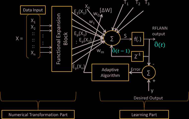 An abstract view of recurrent function link artificial neural network (FLANN) model depicting functional blocks as input and weight correction ∆W on employing back propagation learning algorithm.