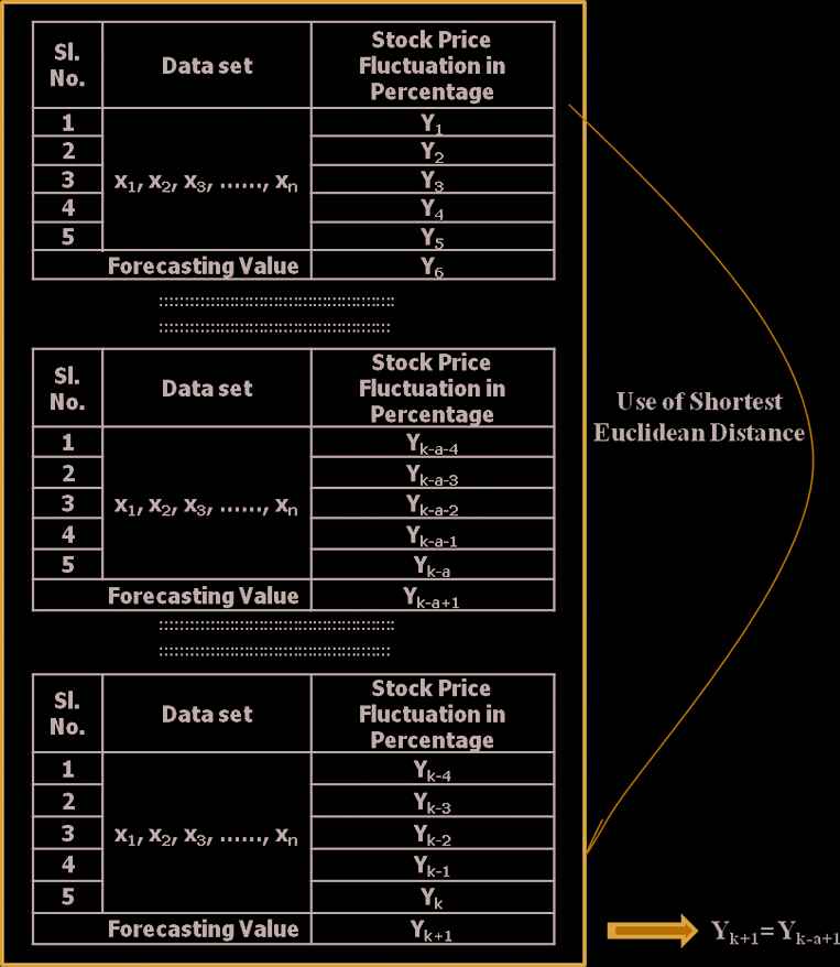 The weekly stock price fluctuation using a CBDW is formulated with a sample database indices as represented in Figure 2; the first window having data for five days 1, 2, 3, 4, and 5, Y1, Y2, Y3, Y4, and Y5 represent a variation in stock price with inputs as Xi where i = 1, 2, …, n. The shortest Euclidean distance between the current data pattern (i.e., five-day stock price variation) and the previous stock price swing in the past six months is computed, which signifies the closest case. Thus, the average stock price variation of the following day, Yk−a+1, can be instrumental in determining the value of Yk+1.