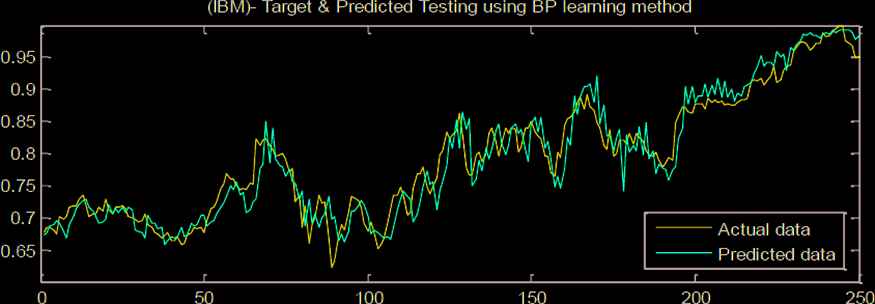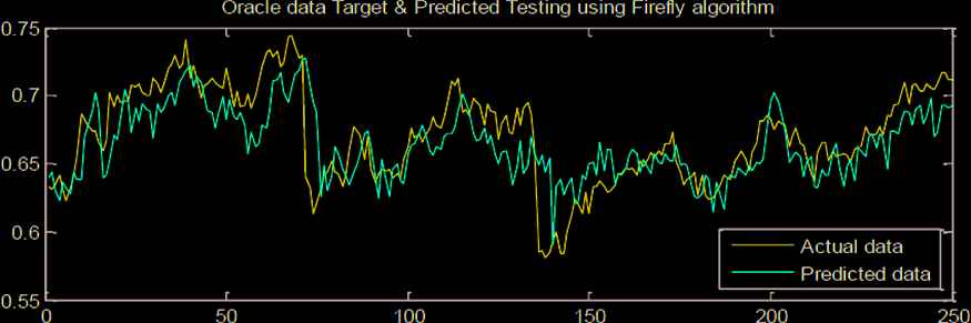 The following Figures 912 are showing the testing results of all the selected four datasets (IBM, Oracle, EURO to INR, and USD to INR) for illustrating the testing results of 250 days on normalized data. These 250 days are considered one day ahead of training data and the same set of dataset used for validating without using FA. The analysis of the results is compared in Table 1 on all the selected datasets to demonstrate the improvement in performance of the model when used FA to optimize learning parameters instead of using random learning parameters.