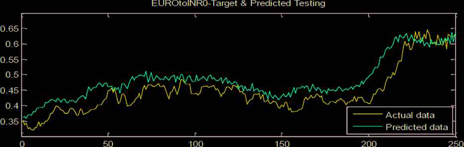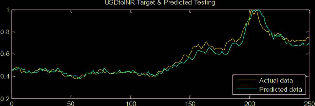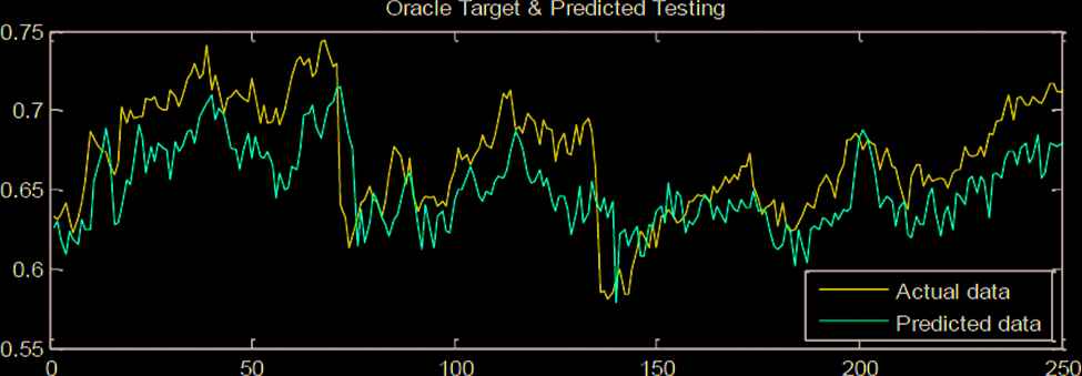 The following Figures 58 are showing the testing results of all the selected four datasets (IBM, Oracle, EURO to INR, and USD to INR) for illustrating the testing results of 250 days on normalized data. These 250 days are considered one day ahead of training data. The proposed model is tested on the various performance indices popularly known as MAPE, MAE and it is represented in Table 1 on all the selected datasets.