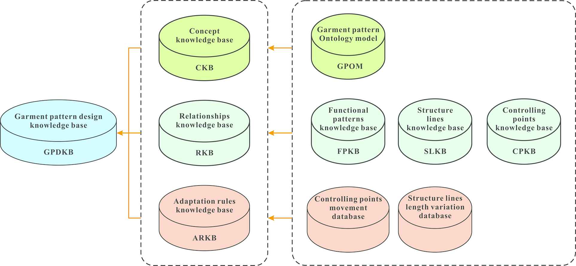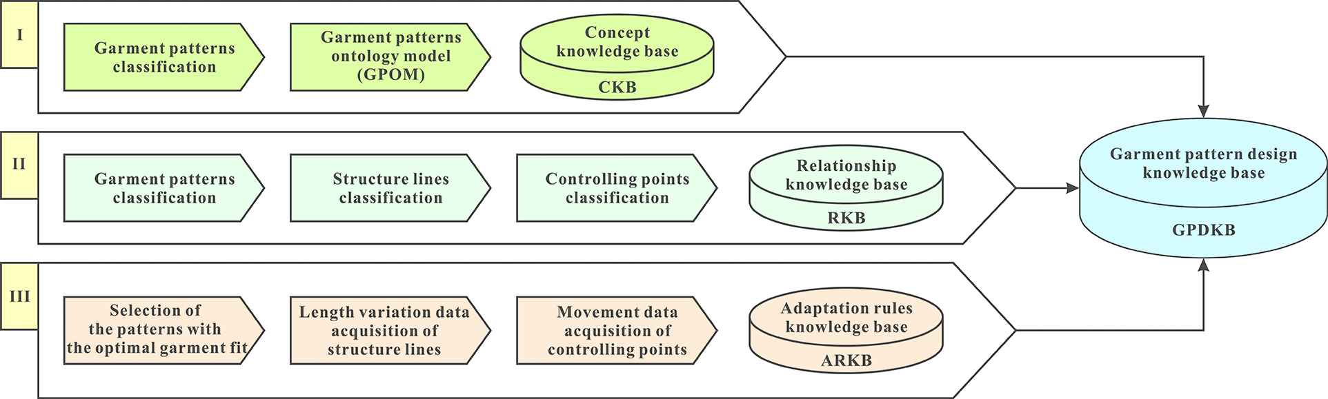 In this study, we proposed to construct a GPDKB (see Figure 1) toward garment mass customization. In this KB, an ontology-based concept knowledge base (CKB) was set up firstly to store the complicated, structured and unstructured information on GP design. Ontology [21] enables the clarification of the relevant concepts in GP design. Furtherly, we built a relationship knowledge base (RKB) for GP design. The RKB is composed of various functional pattern knowledge base (FPKB), structure lines knowledge base (SLKB) and controlling points knowledge base (CPKB). Sensory analysis technique [22] is employed to extract the knowledge from experienced experts on the relationships between functional GPs, structural lines and controlling points (CPs) and quantitatively characterize the relationships between them. More importantly, the GPDKB has an adaptation rules knowledge base (ARKB), enabling pattern parameters prediction and pattern associate adaptation, which is extremely significant in garment mass customization and industry 4.0.