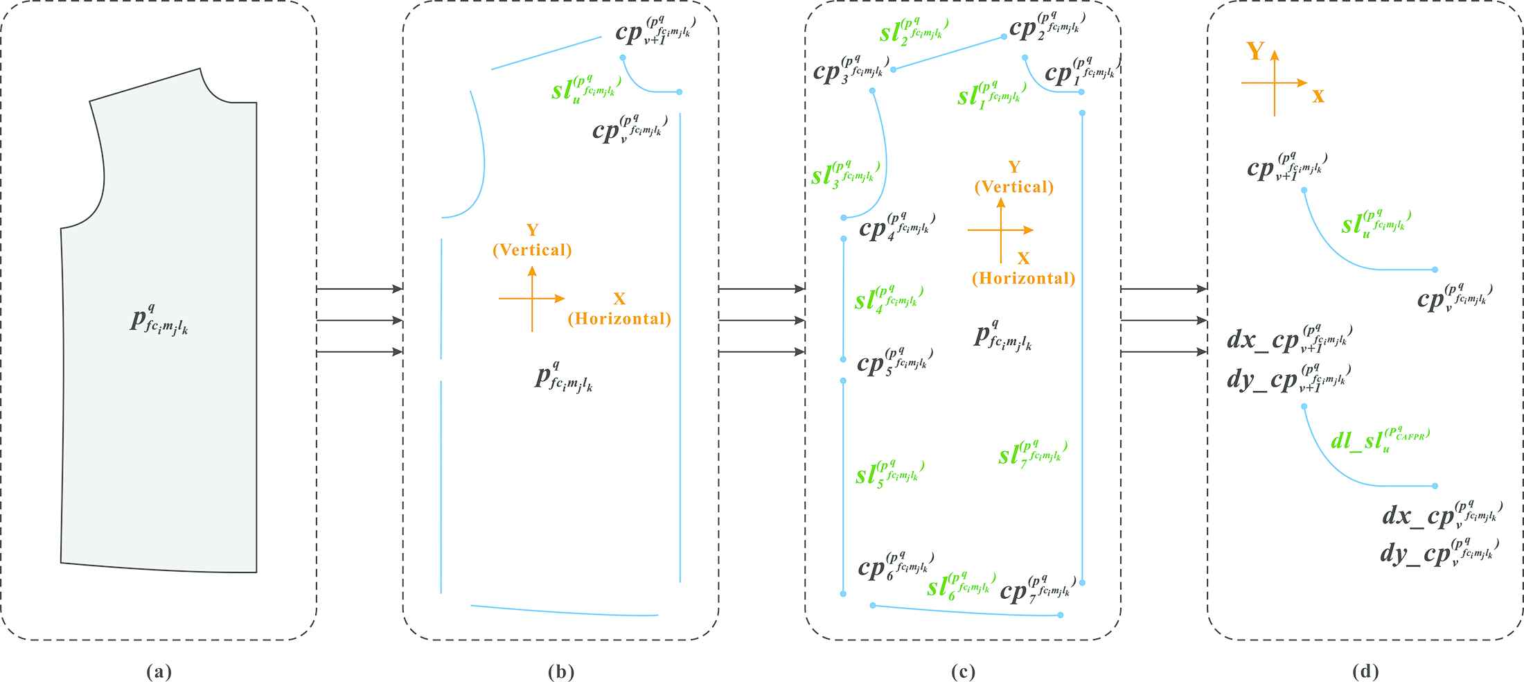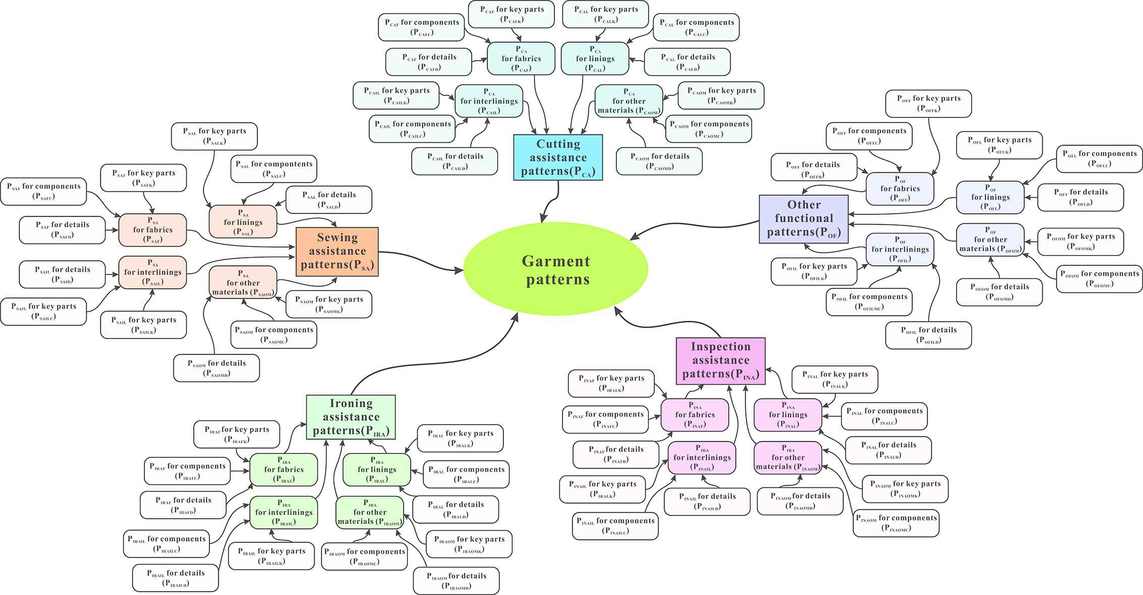 Let PFCML=pfcimjlk1,pfcimjlk2,,pfcimjlkqi1,m,j1,n,k1,p is a set of functional patterns involved in this study, where pfcimjlkq represents the qth pattern piece with the kth level and the ith function toward the jth garment material.