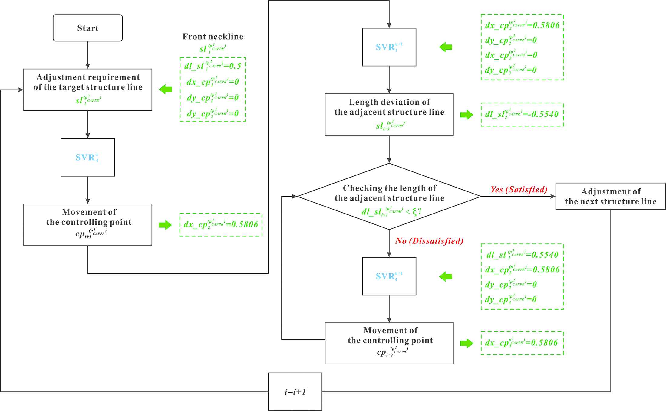 If the length deviation dl_sl2pCAFPR1 is less than a predefined threshold value ϵ, then the adaptation process of the front piece terminates; otherwise we will calculate the movement of the CP cp3pCAFPR1;