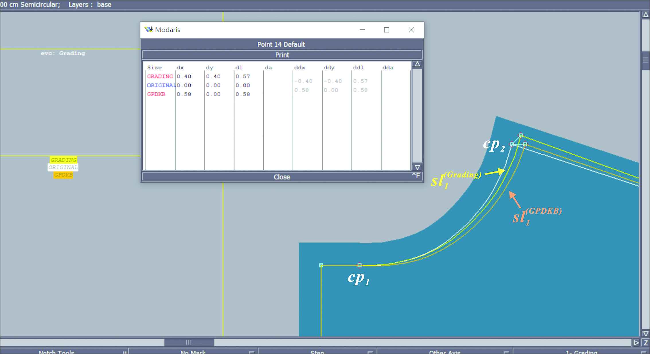 Under the same scenario described in Section 5.1, for a given pattern pCAFPR1, we let dx_cp1grading and dy_cp1grading be zero. According the grading rules given by a standard sizing system like the China National Standard (GB/T 1335.1–2008), we set dx_cp2grading and dy_cp2grading to 0.4. Therefore, the adaptation rule for the sl1pCAFPR1 based on the traditional grading method can be expressed by dx_cp1grading,dy_cp1grading,dx_cp2grading,dy_cp2grading,=0,0,0.4,0.4. And then, we adjusted the sl1pCAFPR1 by the adaptation rules generated from the traditional grading method and the proposed GPDKB in the same software environment (Lectra Modaris). As illustrated in Figure 11, dl_sl1Grading and dl_sl1GPDKB are 0.57 and 0.58 cm, respectively, meaning that the adaptation effects of the two methods are rather closed. From the comparison experimental results, the adaptation effects based on the two methods are equivalent generally, which indicates that the proposed GPDKB is a feasible solution for realizing automatic and intelligent adaptation of the GPs.