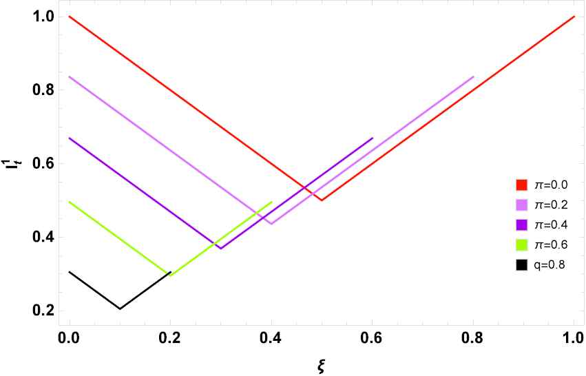 The information content is maximum at (ξRq(t)+νRq(t)) = 1. There are infinite many combinations of membership and non-membership degrees for which (ξRq(t)+νRq(t))=1. The second part remains maximum one for this case that is constant. Therefore, the knowledge is measured based on the first part.