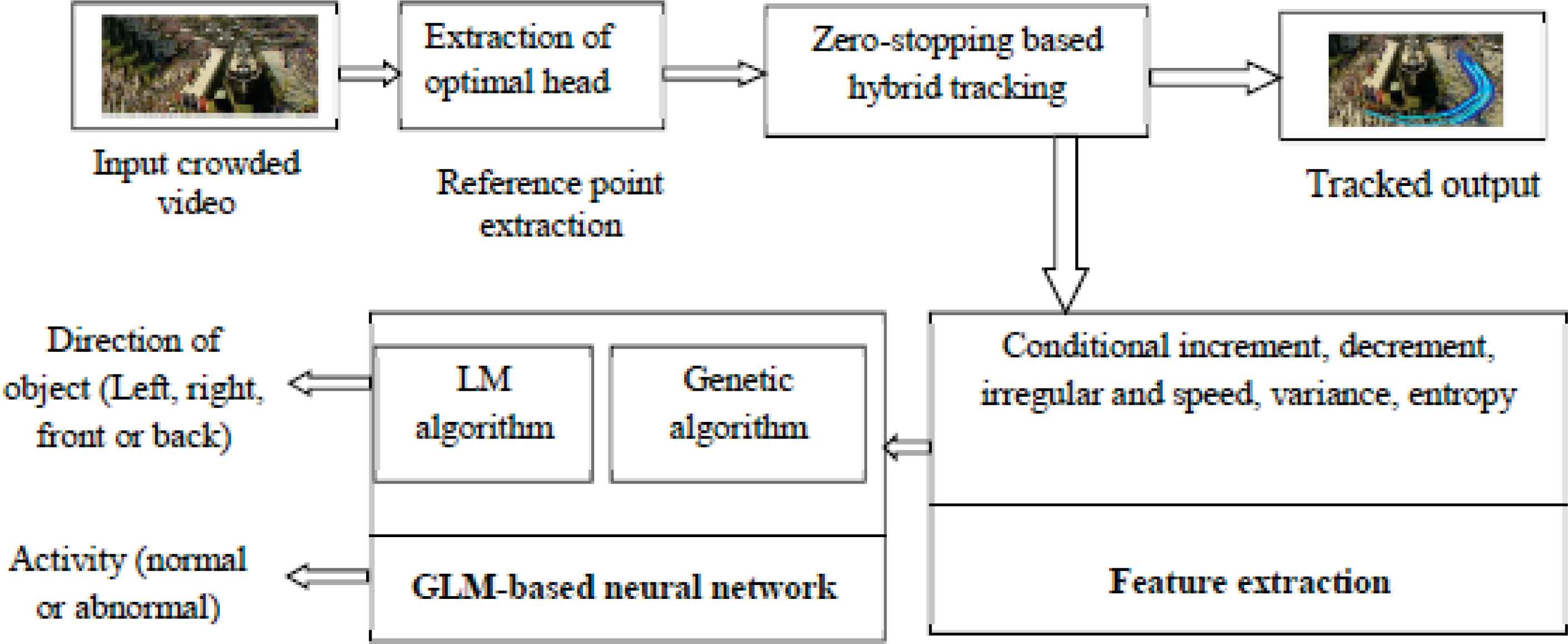 This section presents the proposed crowd behavior recognition using hybrid tracking model and integrated features enabled neural network. The overall process of behavior detection can be performed using three important steps. In the first step, persons presented in the crowd video are tracked using the Zero-stopping constraint-based hybrid tracking model [25]. In the second step, the important physical parameters such as, speed, directivity, variance and entropy are found out as quantitative values from the tracked objects. Then, these two features are utilized to detect the crowd behavior using neural network which is trained with the proposed learning algorithm. The proposed learning algorithm combines the Levenberg–Marquardt algorithm and genetic algorithm for better training process. The trained neural network with two output layers is utilized to detect the behaviors such as, direction of movement (four directions) and activity of person (normal or abnormal). The block diagram of the proposed crowd behavior recognition is given in figure 1.