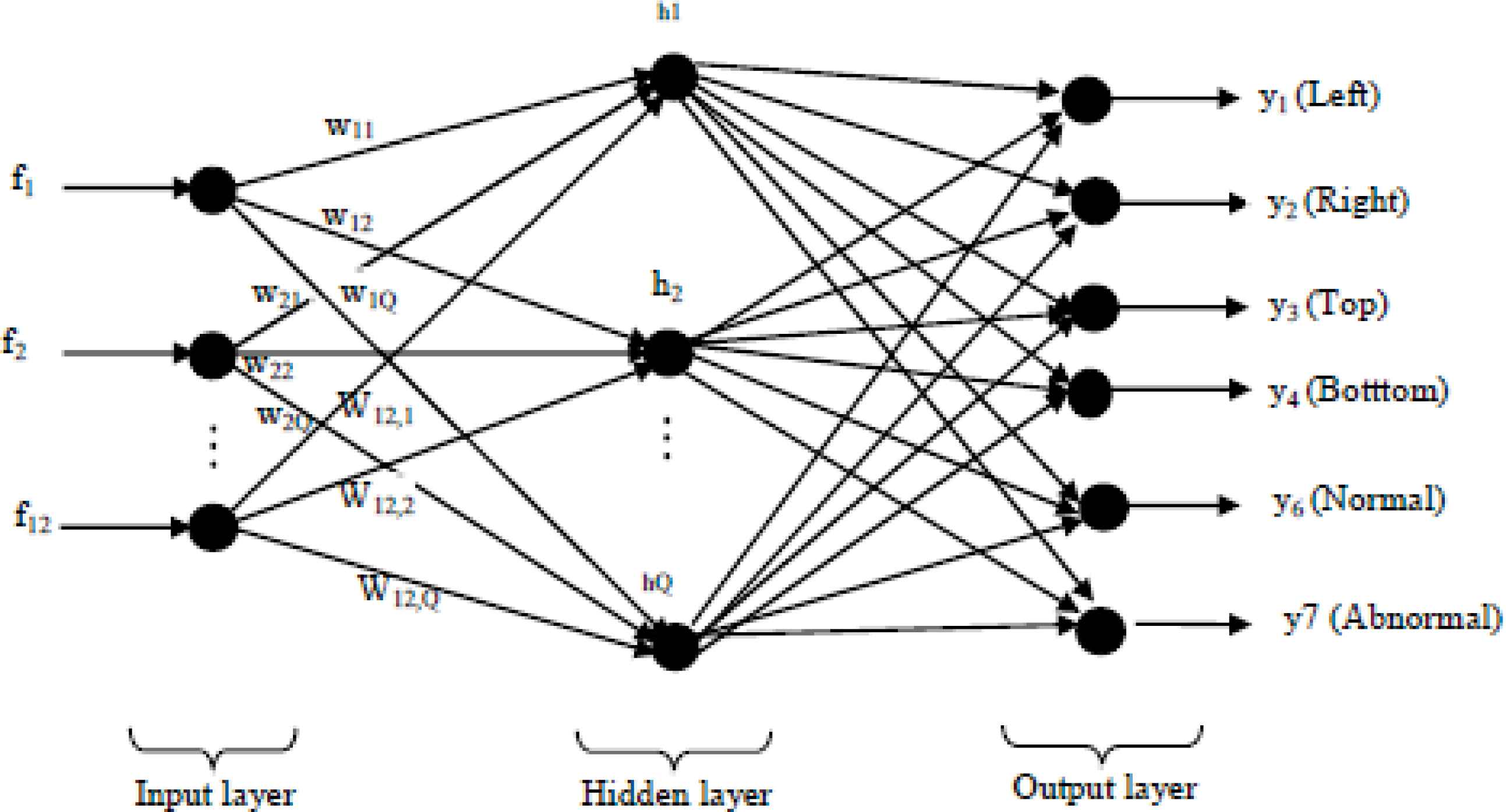 Training by the proposed GLM algorithm: After initializing the neural network architecture, the weight values should be initialized with random value. For the adapted neural network, 12*Q weighted elements to connect the input layer and hidden layer and Q*7 weighted elements to connect hidden layer with output layer. Also, Q bias weights in the hidden layer and six bias elements to connect the output layer. So, weight vector can be represented as,