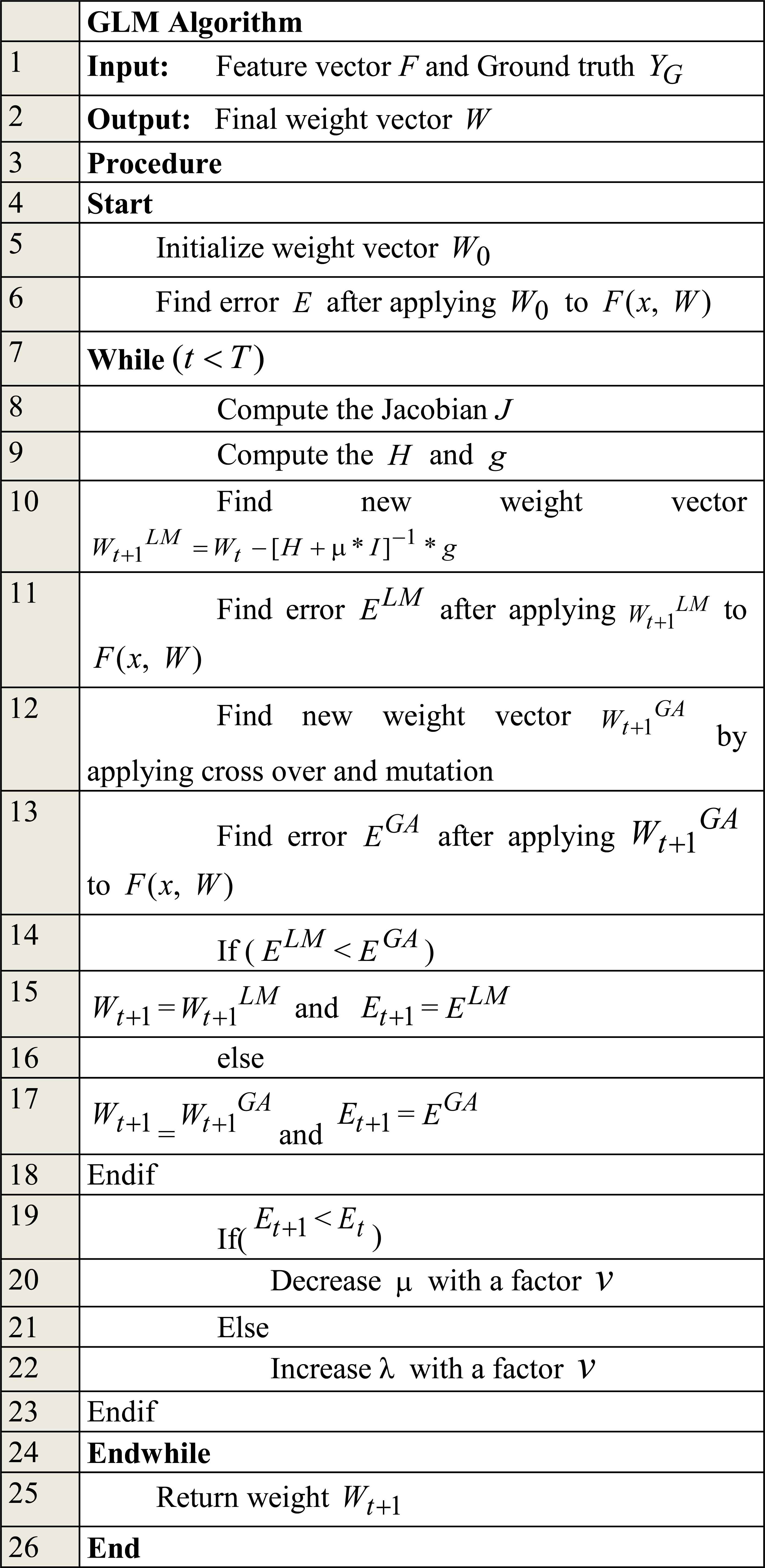 The error of the current iteration Et+1 and previous iteration Et is compared and if the value is decreased, then µ is decreased with a factor v. If the error value is increased, then µ is increased with a factor v. This process is repeated for T number of iteration and the final weights are taken as the trained weights which are then used for the direction and activity estimation of the crowd object. Figure 3 shows the pseudo code of the proposed GLM algorithm.