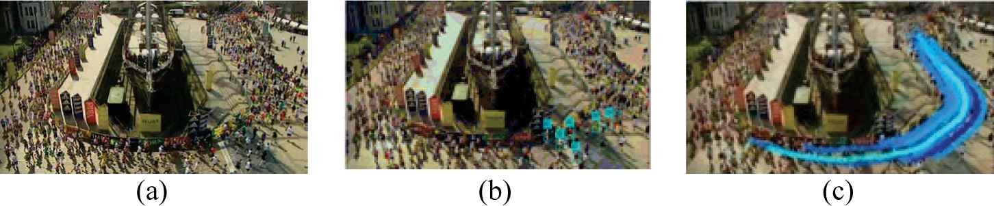 a) sample frame from marathon 2, b) detected object, c) tracking path