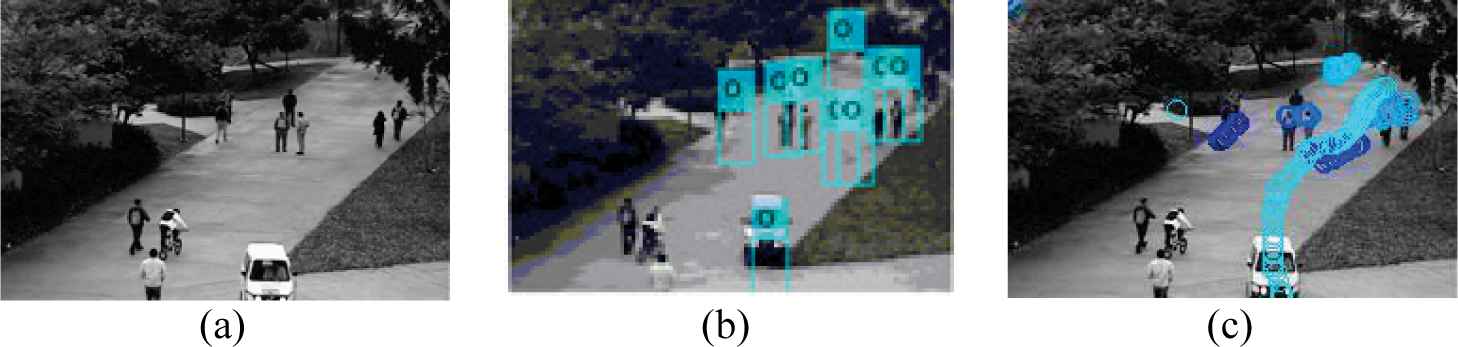 a) sample frame from UCSD-bicycle, b) detected object, c) tracking path