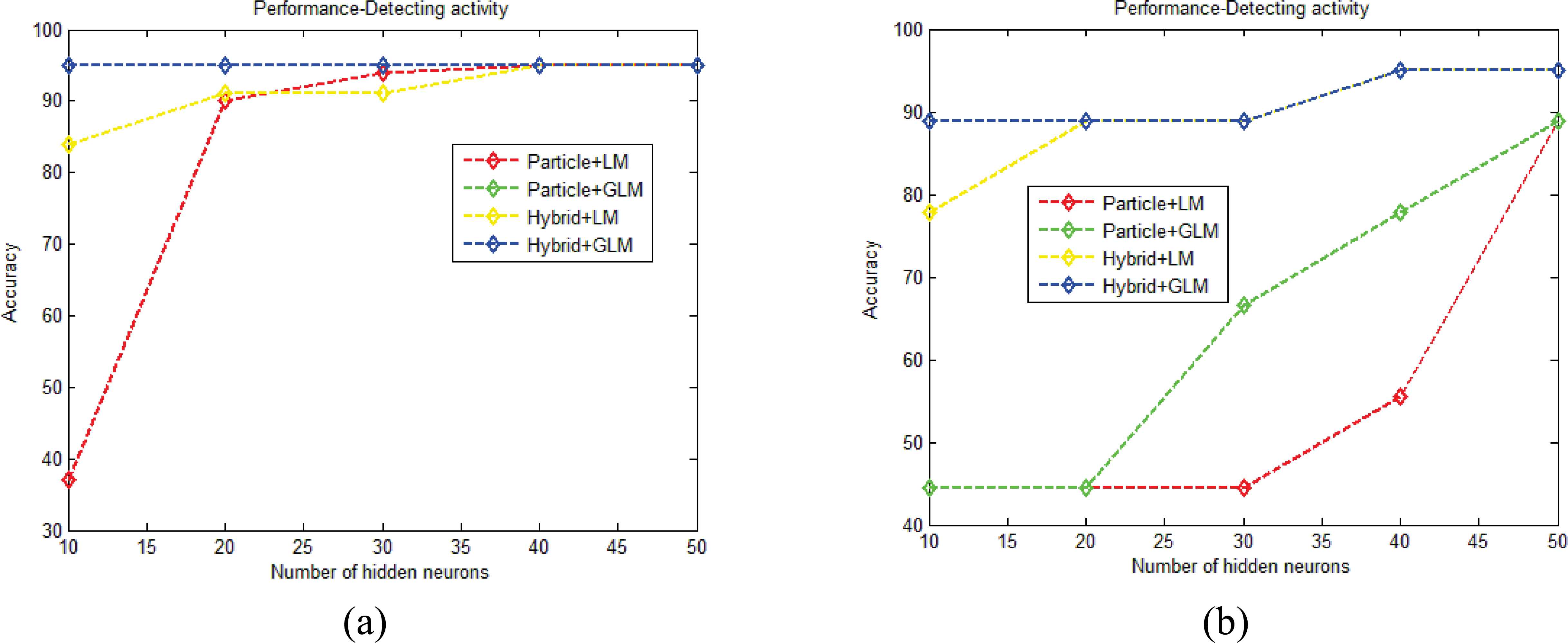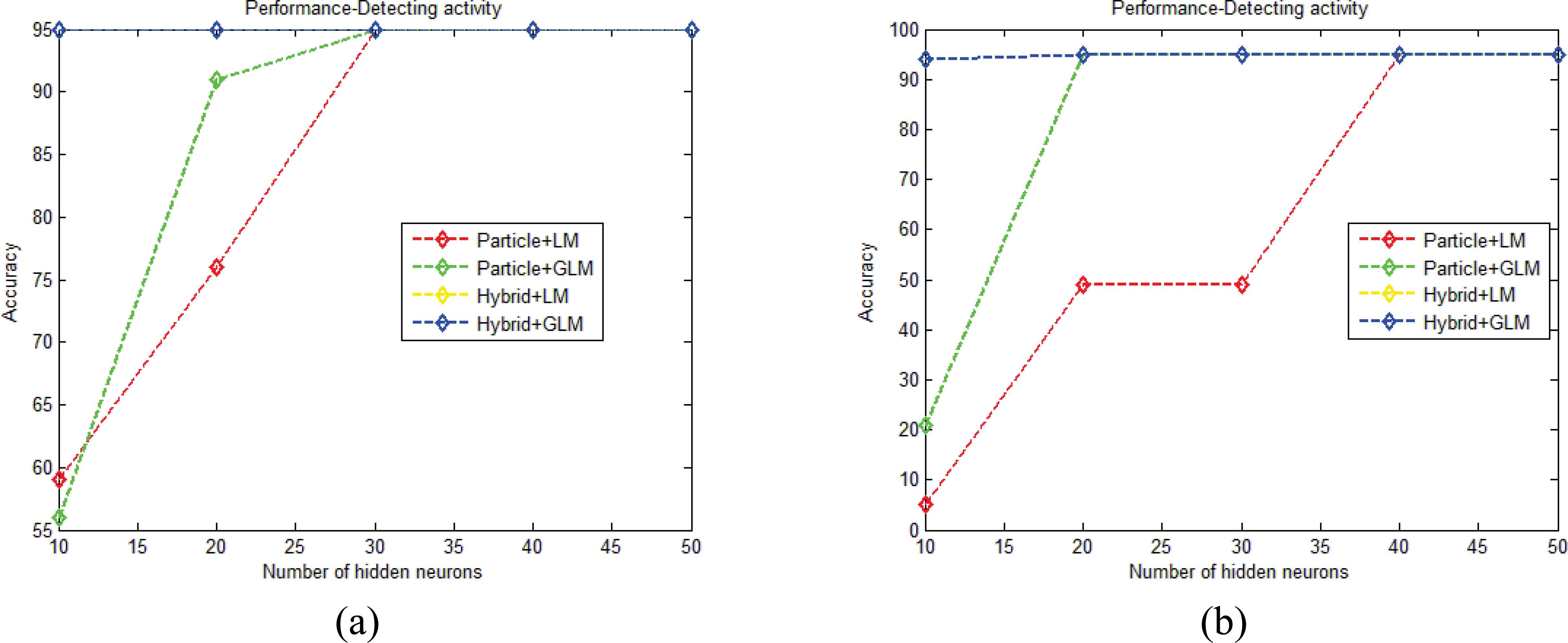 The proposed crowd behavior recognition system is implemented using Matlab 8.3 (R2014a) with a system configuration of 4GB RAM Intel processor and 64 bit OS. Here, the size of hidden layer is fixed to one and the size of hidden neurons is obtained from the experimentation. The comparison is evaluated with the four techniques. Here, tracking model like, particle filtering [24] and hybrid model [25] are considered and classification model like LM-based neural network and GLM-based neural network are considered. So, by integrating these techqniues four methods such as, particle filtering+LM, particle filtering+GLM, hybrid model+LM, hybrid model+GLM are taken for experimental purposes.