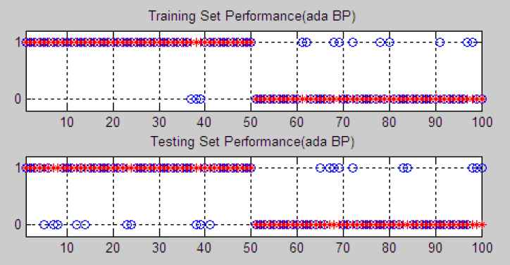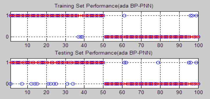 In order to testify whether the proposed model can enhance the accuracy, this section uses three classifiers, which are the Ada BP, PNN and SVM model, to make comparative analysis. Their concrete prediction performances are shown in the Fig. 79. Every figure contains the outcome of training set and testing set.