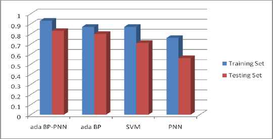 First, it compares prediction results of ada BP-PNN and ada BP models with the SVM and PNN. The models of adaboost algorithm, whether from the training and testing set, have better performance than the latter two models, which can demonstrate that adaboost algorithm is good at FCP. Then, it compares classification performance of ada BP-PNN with ada BP. As shown in Fig. 10, the accuracies of training and testing set from the proposed model are better than the result of the latter model. It is the reason that the new model uses the theory of back-propagation to optimize parameters of PNN. And as a weak classifier, the improved BP-PNN model is integrated by adaboost algorithm. The stronger classifier has better prediction accuracy. Therefore, it can demonstrate that ada BP-PNN model is one better classifier.