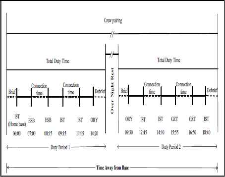 Crew pairing problems attempt to determine the crew pairing with minimum costs that would meet the needs of each flight leg on the schedule. The airline timetable is used as an input at this stage. Then, duties and pairings are generated according to the rules laid down by the airline companies, the Directorate General of Civil Aviation (DGCA) and the Federal Aviation Administration (FAA). Fig. 1 shows the duties and crew pairings generated in line with the flight legs used in the airline’s timetable. The following definitions are used to address the crew pairing problem [3]:
