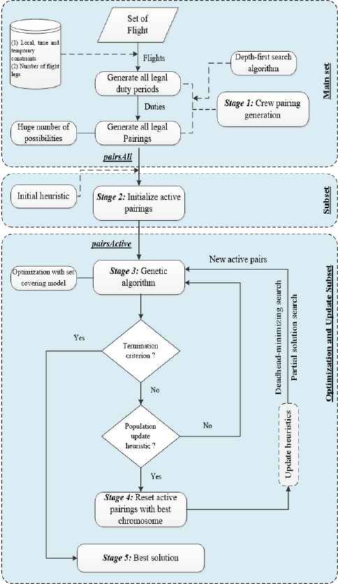 The proposed methodology consists of five stages. (1) All legal crew pairings are generated (pairsAll). (2) A subset is formed by randomly (knowledge-based random) choosing pairings from the generated crew pairings, including all flights (select the initial from pairsAll). (3) The steps of the GA are applied to optimize the problem. (4) After the GA produces a certain iteration, the population’s best chromosome and pairings of this chromosome are kept in memory for the next round. Then, the loop returns to stage 3, and the pairings that will improve the solution (low-cost) in the main set are searched instead of the pairings that will worsen the solution (high-cost) in the subset. In addition, the other developed heuristics algorithm and alternative pairings that will produce the fewest deadheads for each flight are searched. (5) The best crew-paring solution set is obtained by continuously executing procedure stages 3 and 4 until the loop ends. The schematic diagram of the proposed methodology for the crew pairing problem is shown in Fig. 2.