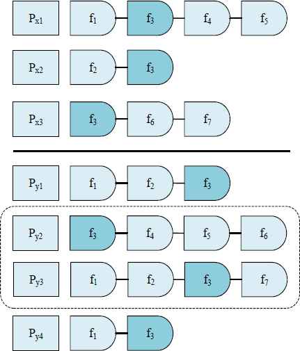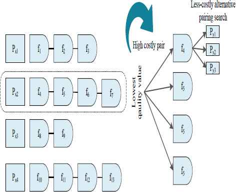 In the above example, the most covered flight among the pairings in the best chromosome is f3. The pairings that cover this flight are shown as Px1, Px2 and Px3, and the flight legs are f1, f2, f3, f4, f5, f6 and f7. The alternative pairings that cover f3 together with f1, f2, f4, f5, f6 and f7 among all pairings are Py1, Py2, Py3 and Py4. Although flight f3 in the best chromosome is covered by pairings Px1, Px2 and Px3, it can be covered by pairings Py2 and Py3 together with all flights by the suggested method. Here, the aim is to make more than one flight covered in the solution set minimum. In this manner, the costs in the goal function can be decreased.